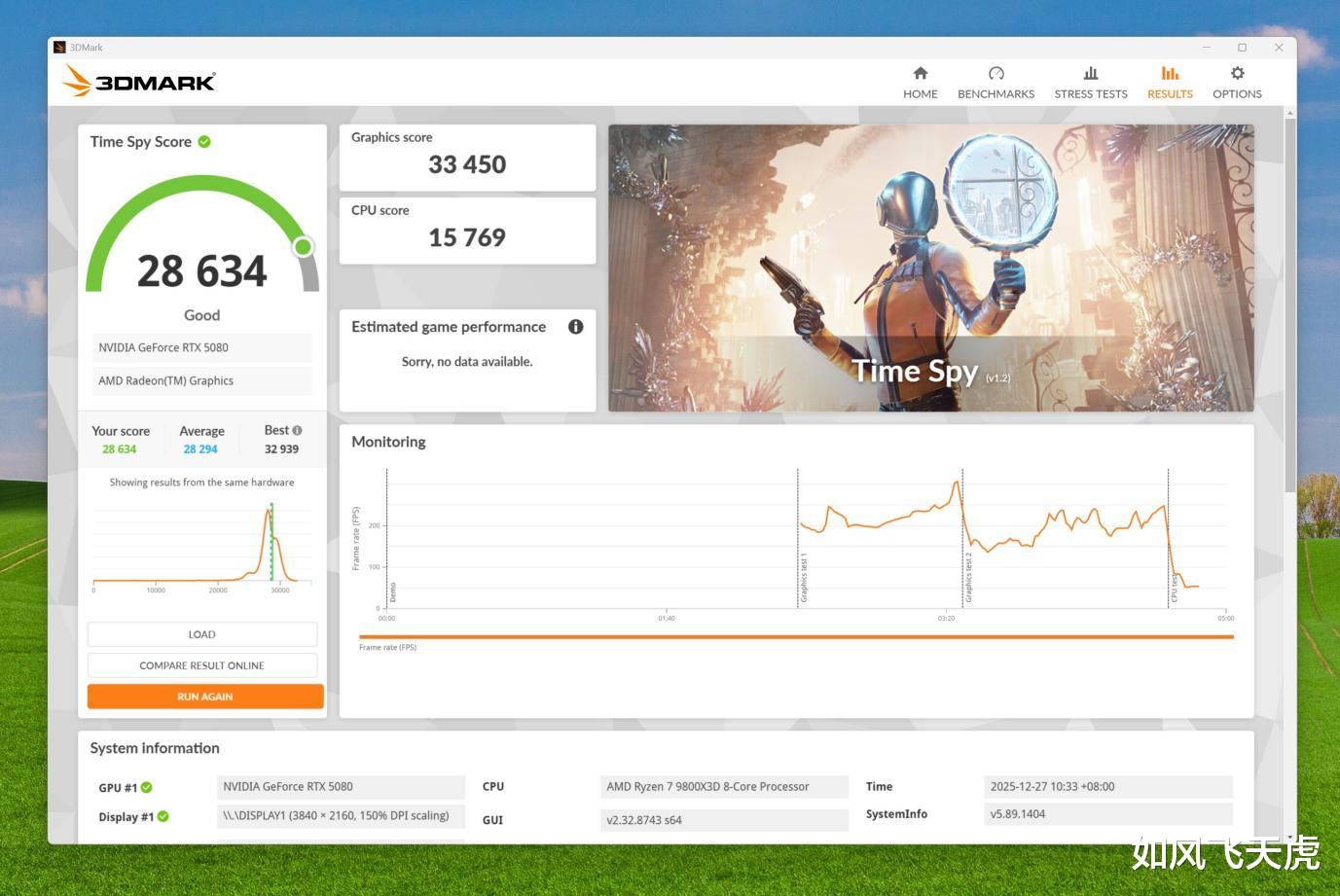 3DMark Time Spy 测试,总分28634,其中图形得分33450,CPU得分15769。