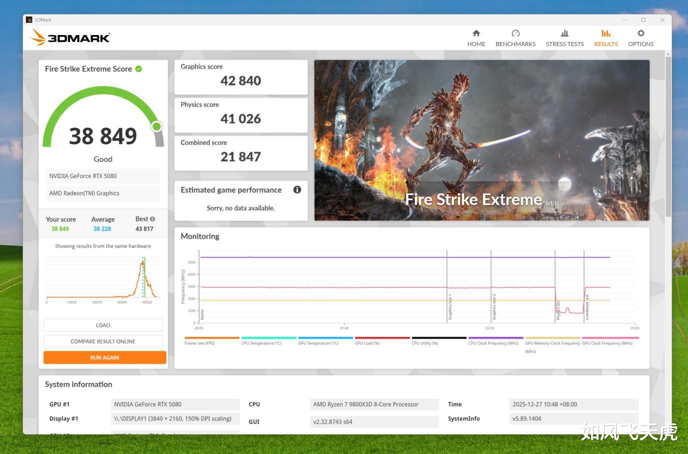 3DMARK Fire Strike Extreme测试,总分38849,其中图形得分42840,物理得分41026,综合得分21847。