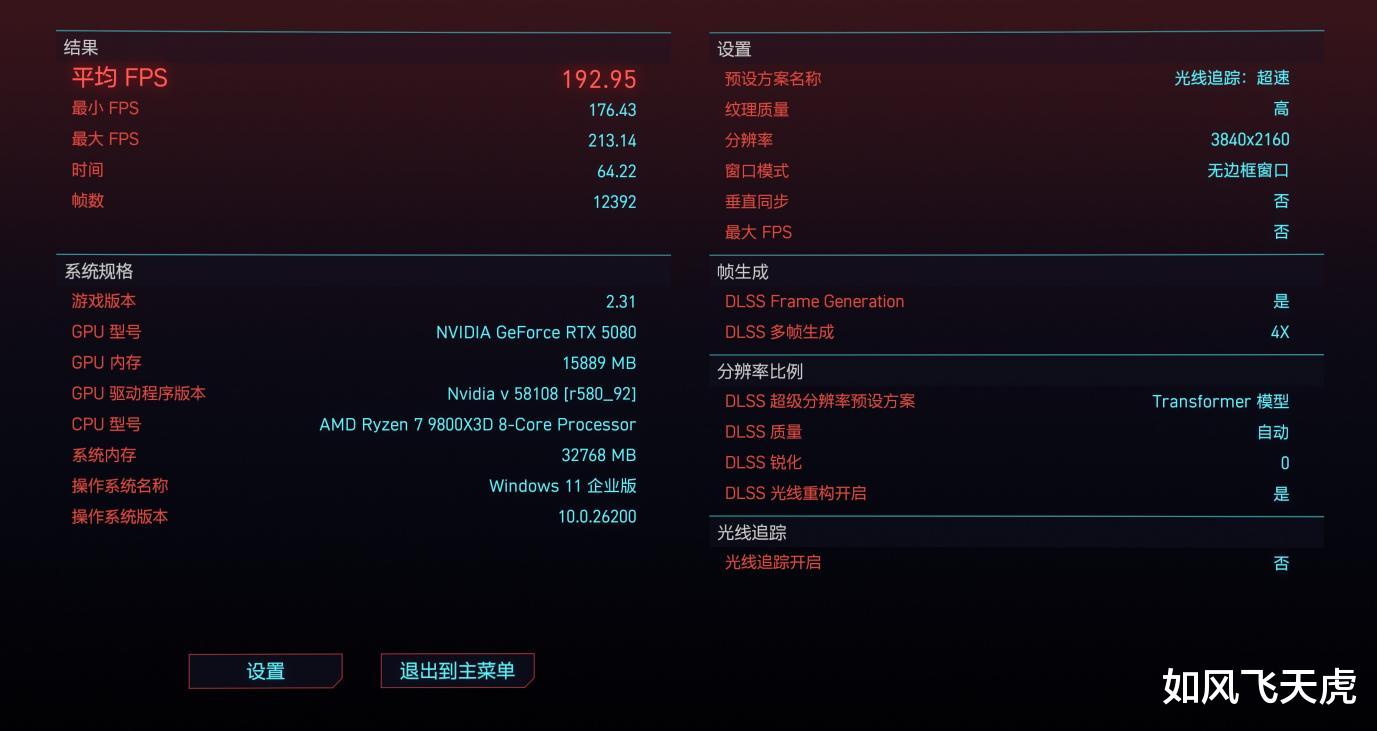 赛博朋克2077测试,4K分辨率,选择预设方案里最高的光线追踪:超速,DLSS 4X,最终平均帧率是192.75帧,最小FPS 176.43,最大FPS 213.14。改为2560x1440 2K分辨率,同样画质下,最终平均FPS 261.32,最小FPS 236.77,最大FPS 289.34。1080P同样画质下,最终平均FPS 341.49,最小FPS 297/78,最大FPS 393.11。