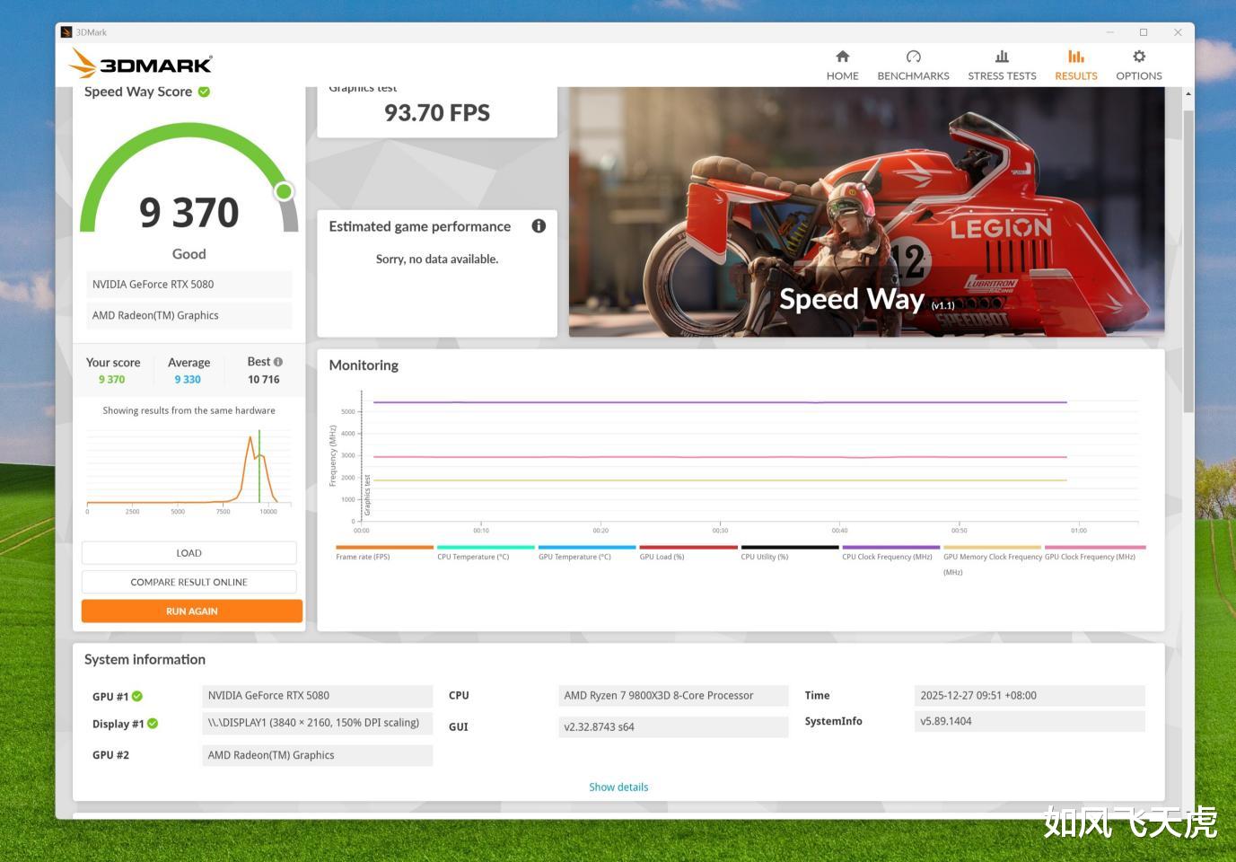 首先是3DMARK Speed Way测试,测试得分9370,93.79帧。3DMark Speed Way 是一项基于DirectX 12 Ultimate 的图形基准测试,主要用于评估游戏PC在运行现代光线追踪游戏时的性能。 它专注于测量显卡在实时光线追踪场景下的表现,包括光线追踪反射、实时全局光照、网格着色器和体积照明等DirectX 12 Ultimate功能,模拟次世代3A游戏的视觉效果和性能需求。