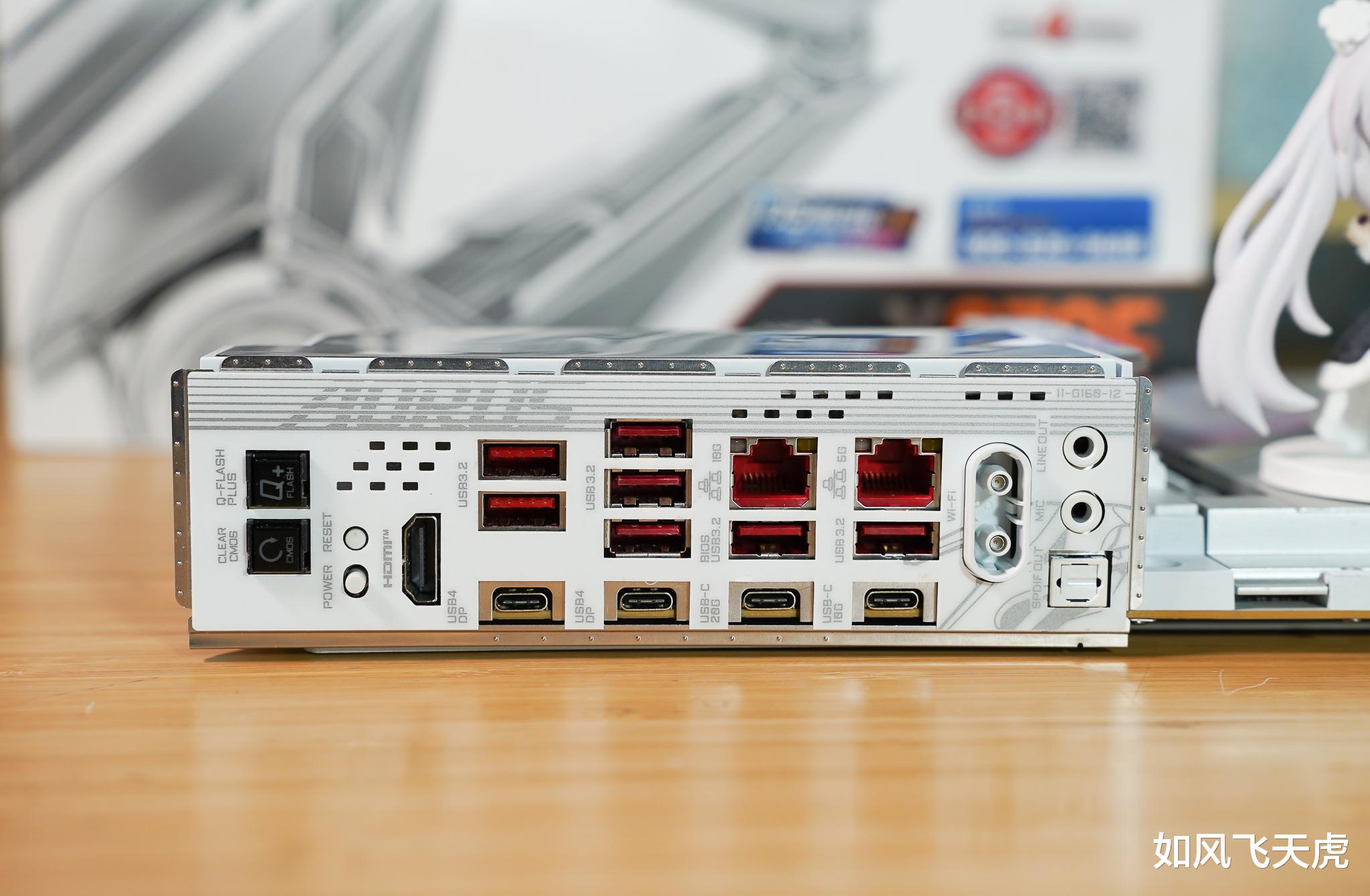 主板有4根DDR5内存插槽,支持超频至9000+MT/s,速度拉满。内部加装抗干扰遮罩,信号更稳定;采用菊链式布线,减少信号损耗,让内存跑得更快更稳。主板接口多到“离谱”——风扇/水泵接口最多10个,ARGB接口3组,扩展自由度直接拉满。前置支持USB 3.2 Gen 2x2(20Gbps),少见却实用。还自带温度和噪音检测接口,监控更精准,还有内置HDMI输出。