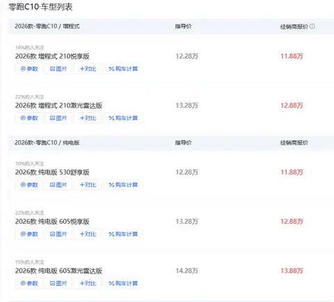 说到这里,可能很多人会关心,配置这么丰富,价格会不会超出预算?其实零跑C10的价格还挺亲民的,2026款的官方指导价在12.28万-14.28万元之间,就算是搭载了激光雷达、800V快充、高通8295芯片的顶配纯电版,价格也才14万出头,在15万的预算范围内。这样的价格能买到这样的配置和空间,性价比还是很高的。