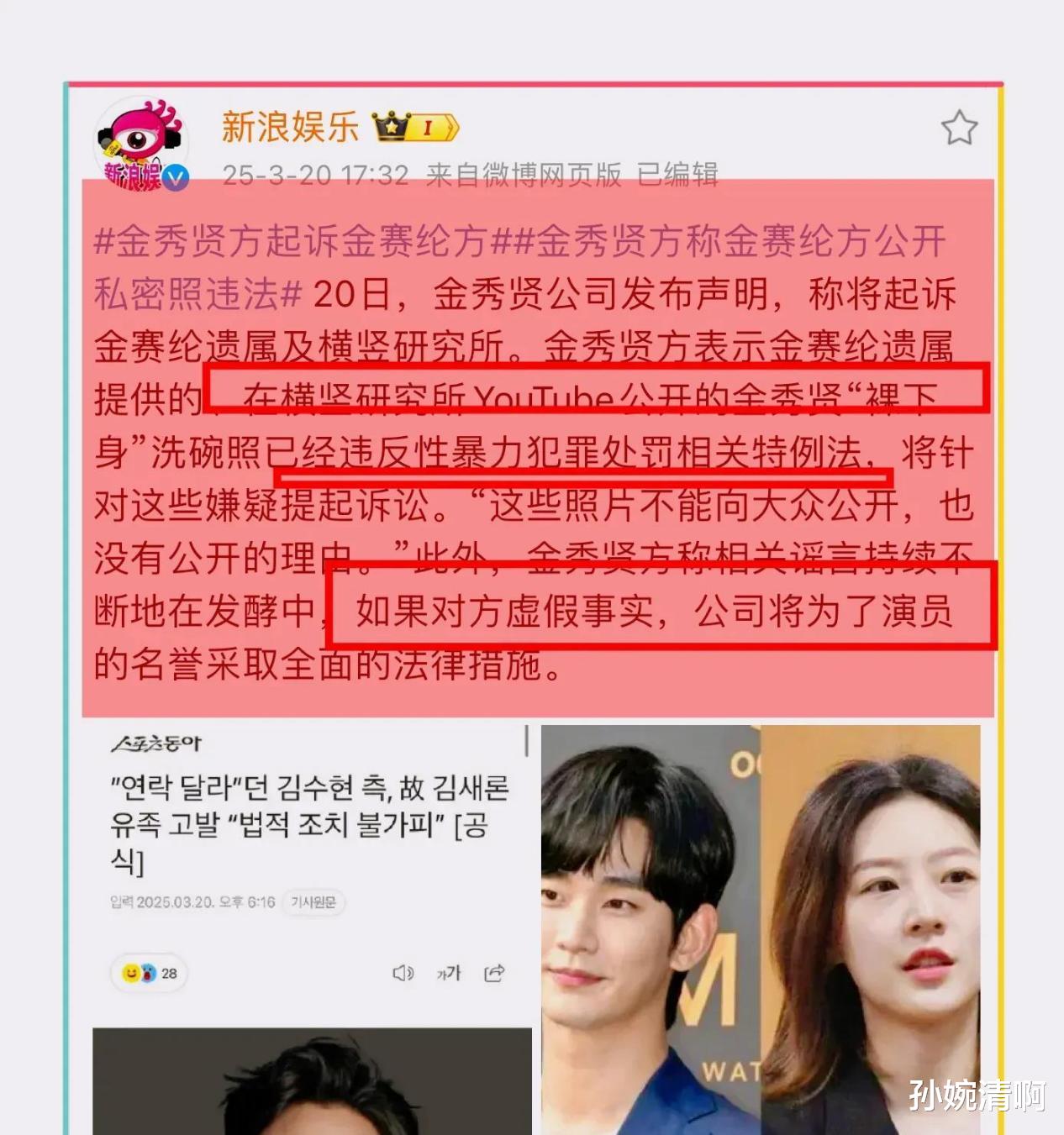 事件的另一焦点在于金秀贤被曝光的私密照片和视频。据称,这些照片和视频由金赛纶家属提供给某研究所,随后被公开传播,对金秀贤的声誉造成严重损害。金秀贤方已表示将起诉金赛纶家属及相关机构,维护自身合法权益。