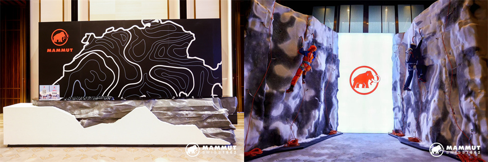 现场签到台融入等高线元素,象征品牌与高山的深厚关联,彰显MAMMUT猛犸象对攀登精神的致敬。此外,通道展示区特别设有攀岩拍照打卡装置,通过高度还原的攀岩墙和道具,吸引嘉宾驻足体验,让他们切身感受户外攀登的激情。
