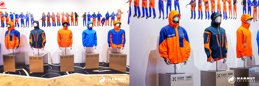 本次2025秋冬订货会现场,MAMMUT猛犸象以巍峨高山的壮丽与对其的敬畏之情为灵感,精心打造了四大户外场景,涵盖高山攀登、滑雪、徒步及都市探索系列,为嘉宾呈现了一场沉浸式的专业户外探索体验。入口处,以雪山廓形为背景的艾格极限系列六代(Eiger Extreme Nordwand 6.0)一经亮相便凭借强大的视觉冲击力吸引众人瞩目。旁边巨大的橙色“X“搭配瑞士标志,代表了象征向群山极限探索的艾格极限系列。艾格极限系列的展区装置巧妙运用岩层与登山绳索元素,彰显出登山运动的力量与坚韧。外围艾格极限系列历代产品的展示区,则全面呈现该系列历经六次科技革新的卓越创新精神,为每位探索者提供强悍保护,助力他们征服极限,攀至巅峰。