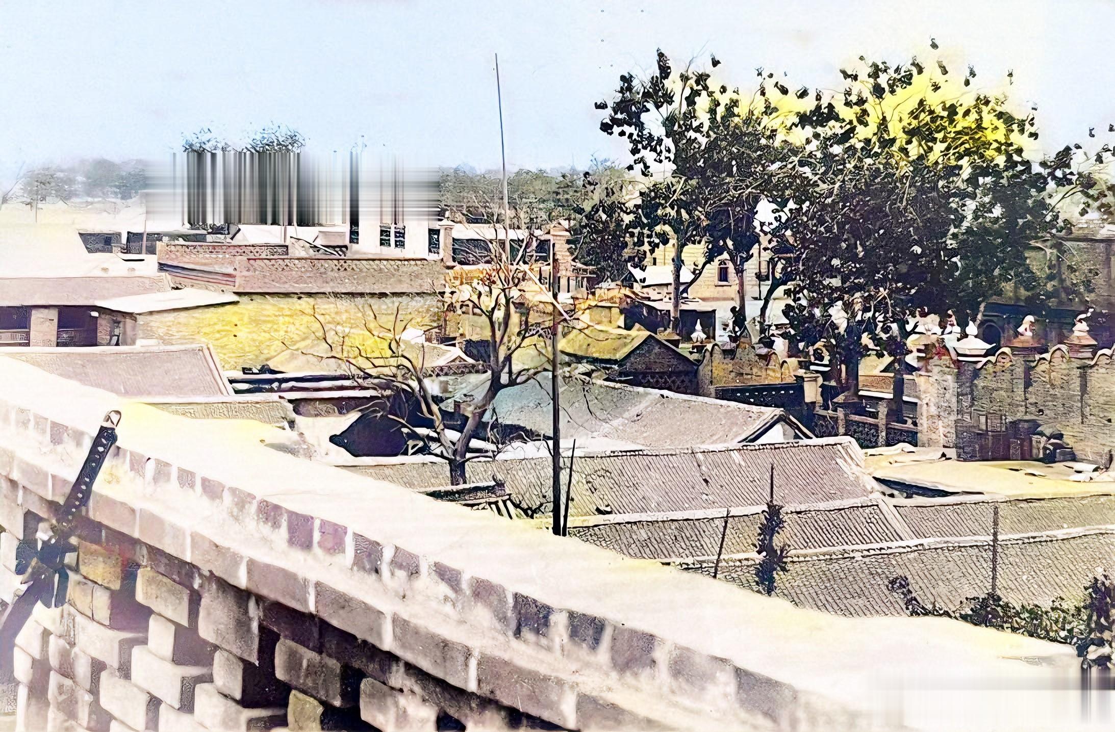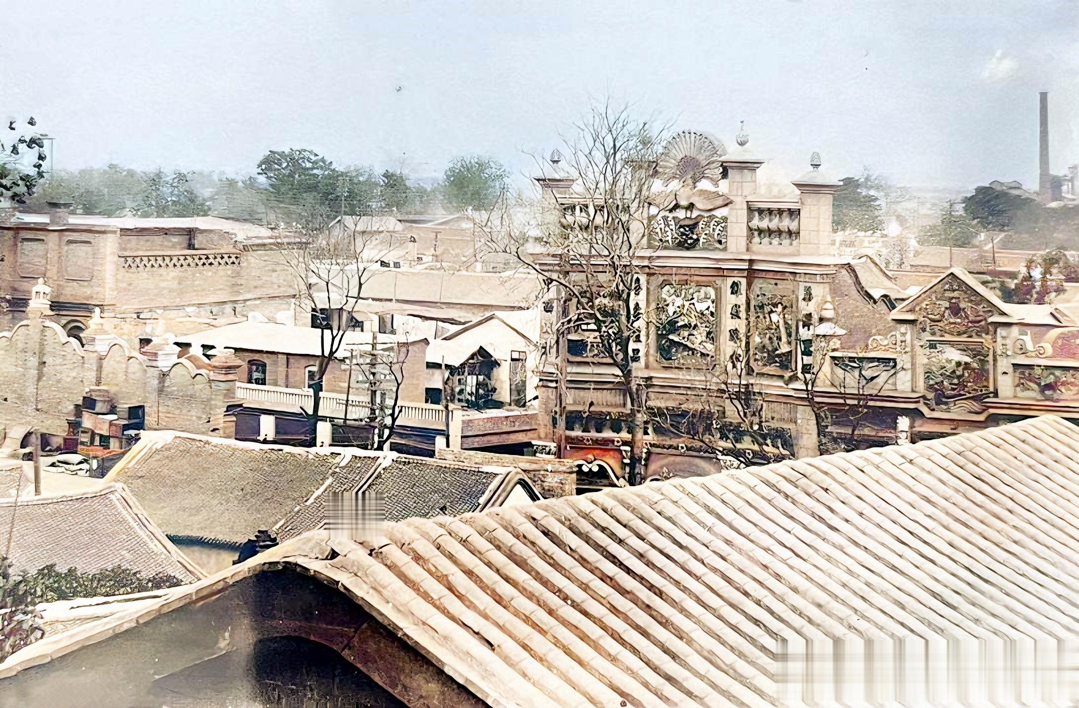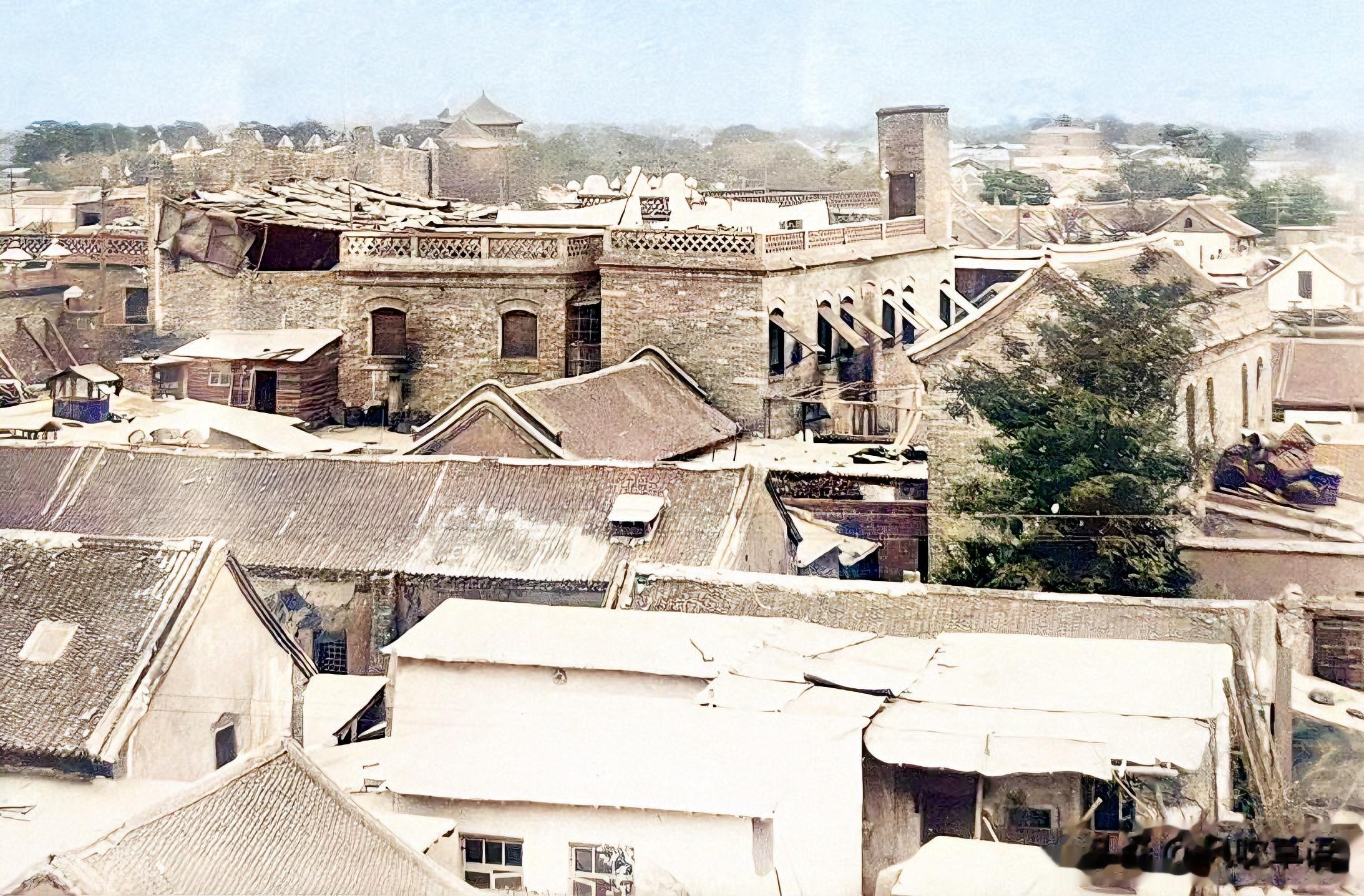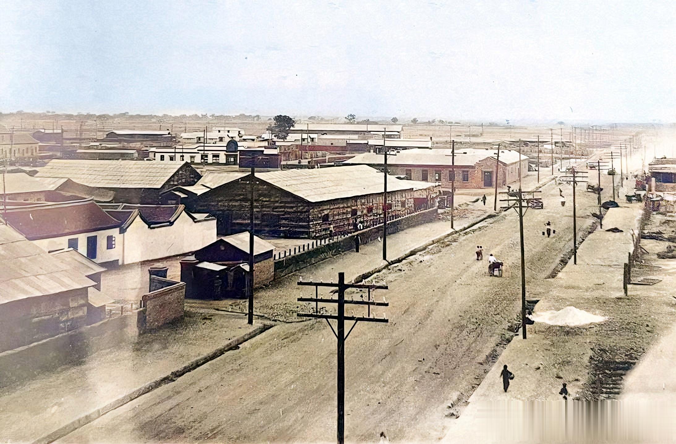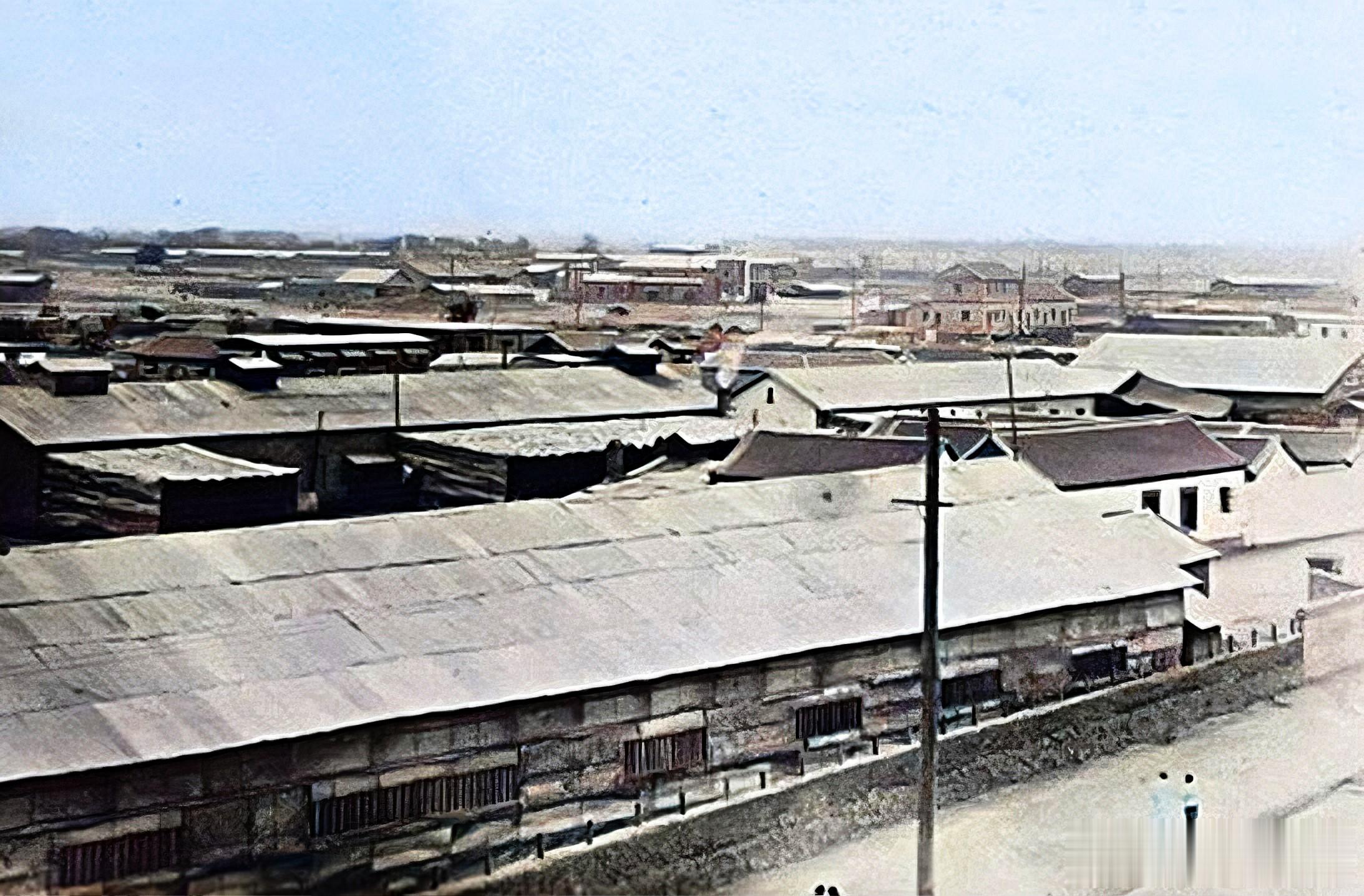 这是站在玉屋旅社楼顶上往偕行社方向看到的景象。当时的河南大街区域是日军在新乡的行政和商业核心区,可以看到堆着货物的仓库和改建的日式住宿楼。