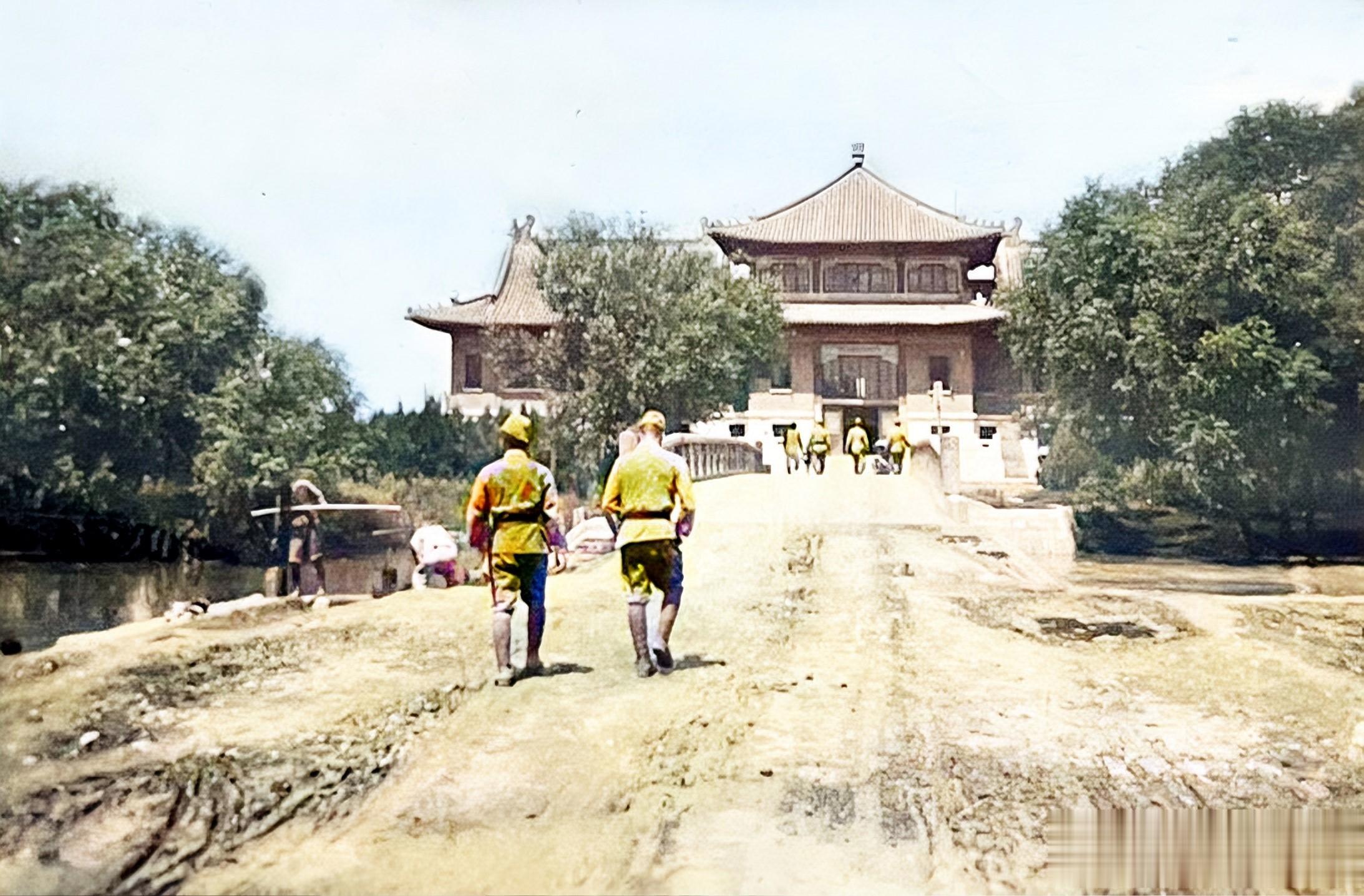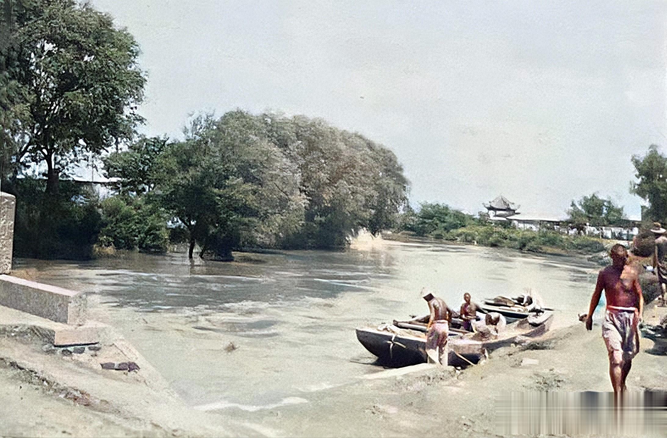 北门外的卫河此时正值汛期,水流十分湍急,可以看到岸边有许多树木都已淹没在水中。在远处河岸的右侧可以看到一排建筑,那是日本人开设的陆军病院。