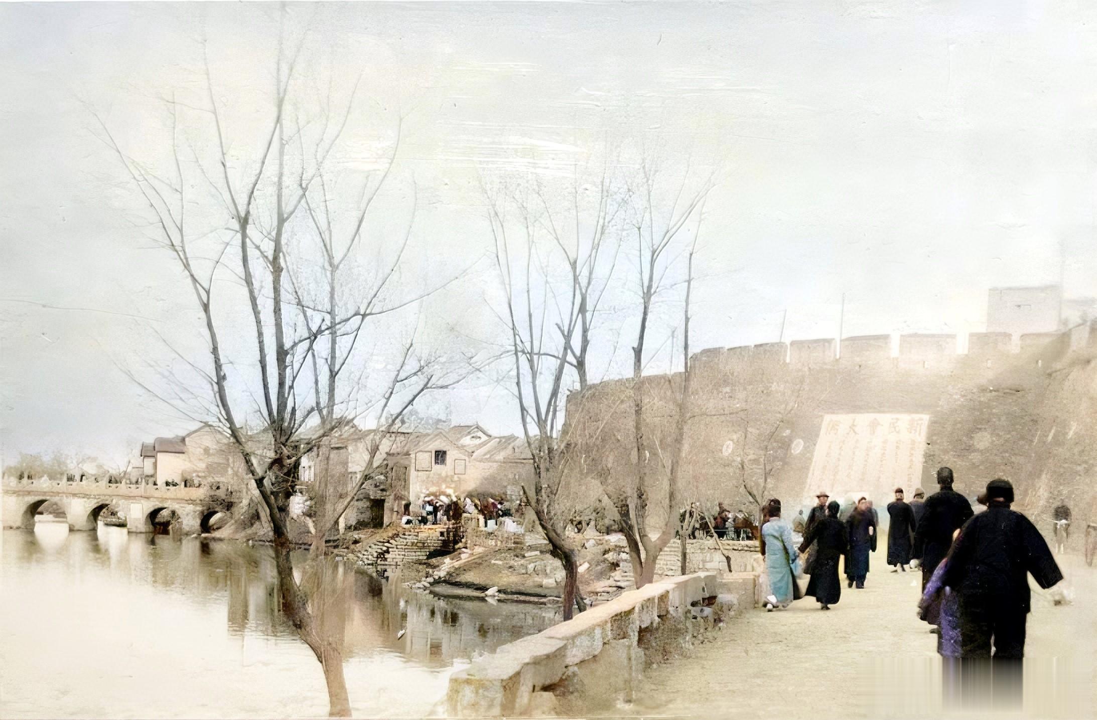 这是1939年底新乡北门附近的情况,高大的城墙上有汉奸组织书写的《新民会大纲》。城墙外的河流是卫河,可以看到远端卫河上的民乐桥。当年侵华日军就是跨过这座桥进入新乡城的。
