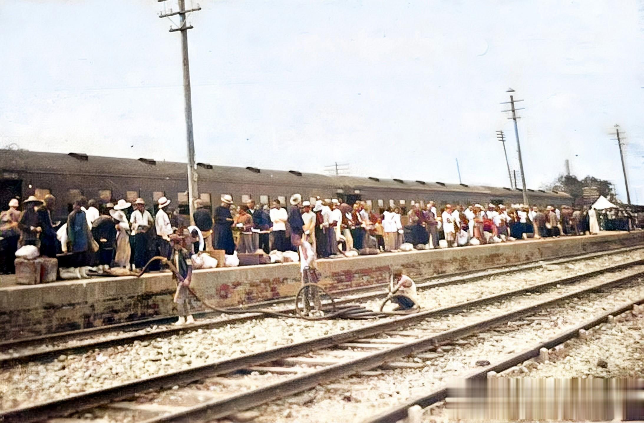 新乡火车站,一列从北京方向驶来的客运列车停靠在站台上。站台上聚集着正在接受日本人盘查行李的旅客。站台下,有几名男子正在用胶皮管给火车供水。