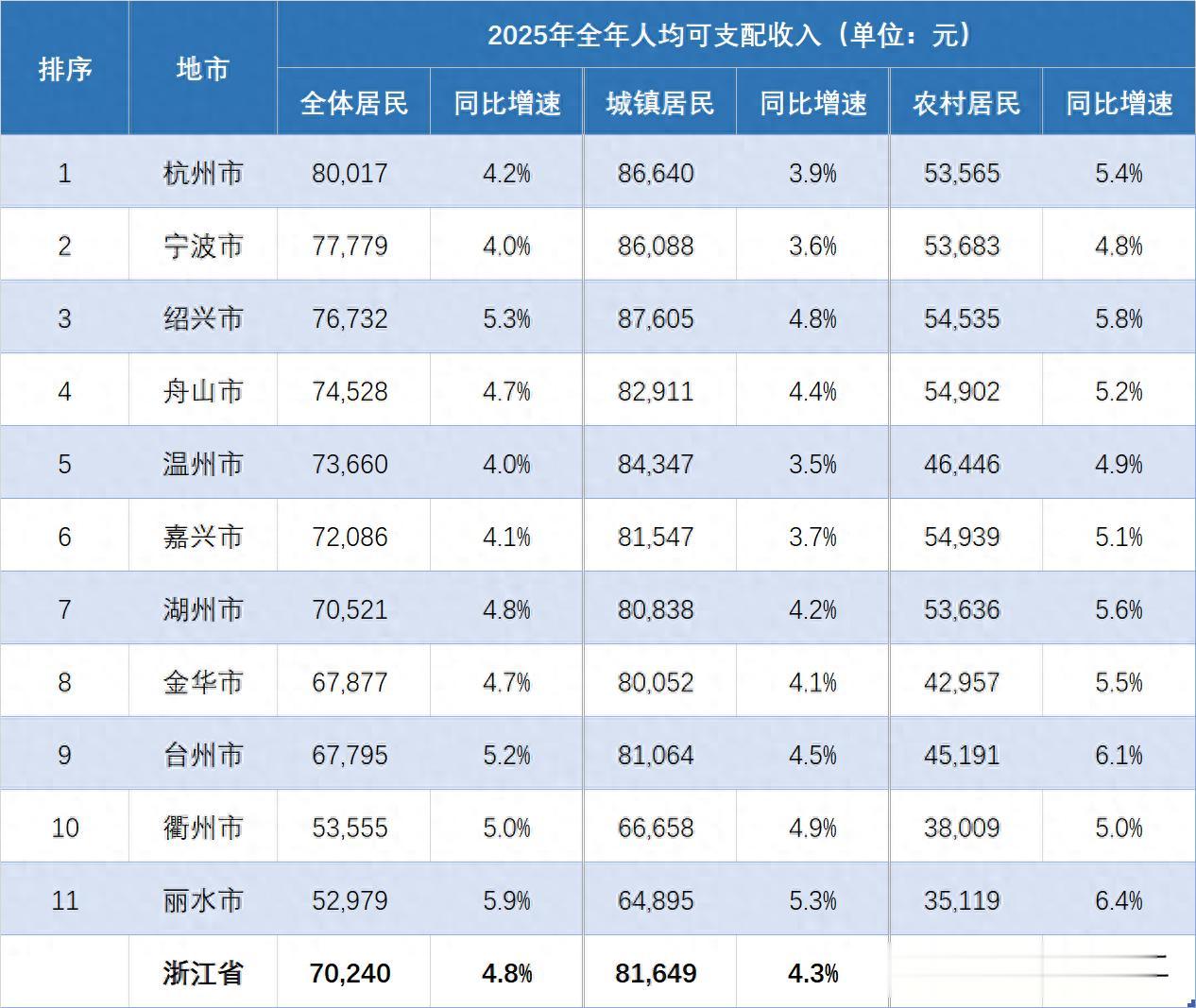 浙江省是我国经济最为发达的省份之一,GDP总值常年位居全国前二,居民人均可支配收入在31个省市区中更是稳居前三。2025年度,浙江省全体居民人均可支配收入金额达到了70240元,首次跨过七万元门槛,较上年同期增长4.8%。其中城镇居民人均收入为81649元,同比增长4.3%;农村居民人均收入为45154元,同比增长5.5%。
