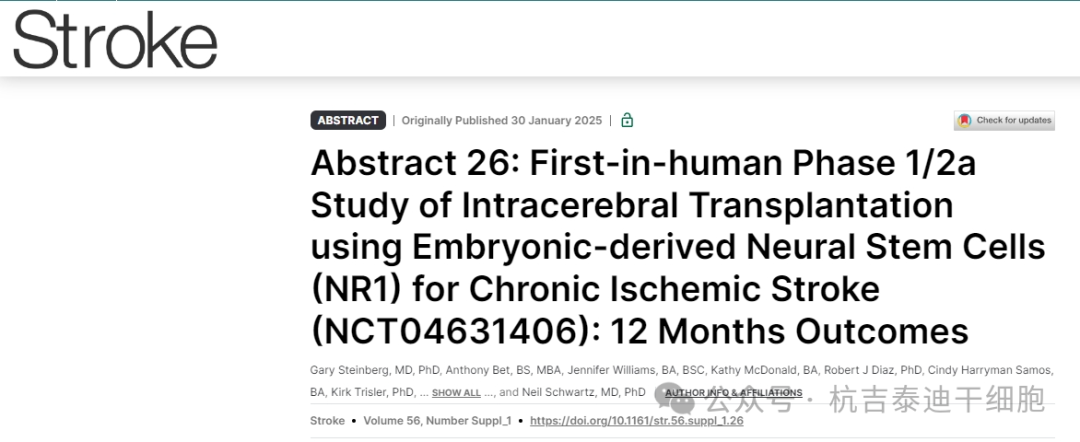 本研究首次利用胚胎源性神经干细胞 (NR1) 进行脑内移植治疗慢性缺血性中风的1/2a期人体研究 (NCT04631406),旨在在12个月内评估 NR1脑内移植对慢性中风患者的安全性和有效性为后续疗效验证奠定基础,同时回应学界对NSCs临床可行性的核心关切。