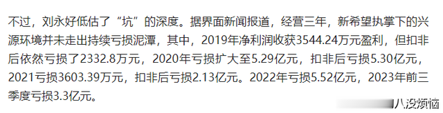 刘永好接手后,兴源环境连续四年亏损,从2019年到2023年第三季度,不到五年的时间,公司累计亏损了16亿多,营收从24亿缩水到不足7亿,负债率却飙到88%,这个坑简直可以称之为史诗级别的。