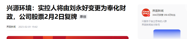 兴源环境:实控人将由刘永好变更为奉化财政,公司股票2月2日复牌——界面新闻2023-02-01