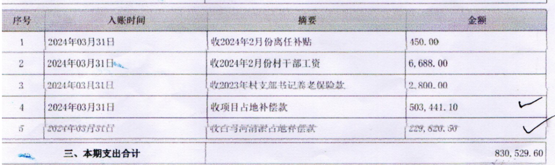 近日,有网友向我们提供了一份村里的财务收支公开明细表,显示:2024年3月份,邹城市郭里镇卧牛村账务收支公开明细表中显示,仅3月份共计收入743199.6元,其中包括了村干部工资、养老保险、清淤补偿款、项目占地补偿款,村民质疑项目占地补偿款是哪个项目?为什么没见任何公示。