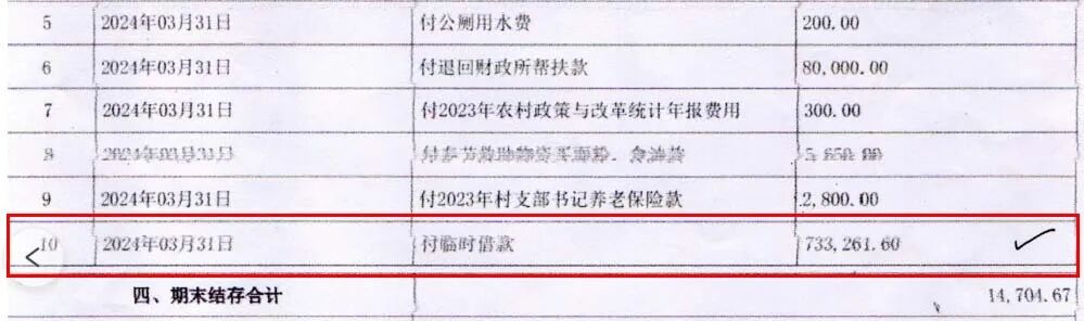 74万的收入,公开明细表显示,3月31日,村临时借款733261.6元(73万)。