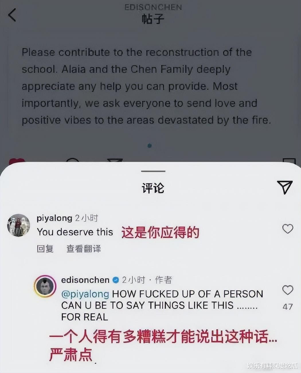 然而,就在陈冠希积极为女儿学校募捐的同时,网络上却出现了一股不和谐的声音。部分网友对他的善举不仅不给予支持,反而冷嘲热讽,甚至用“这是你应得的”“活该”等刺眼言论进行攻击。这些言论无疑像一把把锋利的刀,刺痛了陈冠希的心。