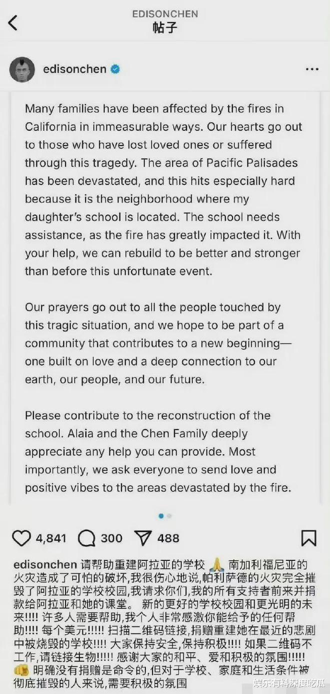在近日美国洛杉矶地区遭受的严重山火灾害中,无数家园和设施化为乌有,其中就包括著名艺人陈冠希女儿就读的学校。这场突如其来的灾难,不仅给当地居民带来了深重的损失,也让远在他乡的陈冠希心急如焚。作为一位深爱女儿的父亲,他迅速在国外的个人社交媒体上发声,呼吁社会各界伸出援手,共同为学校重建贡献力量。