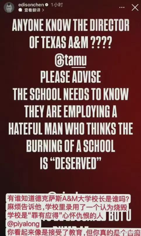 面对网友的嘲讽,陈冠希没有选择沉默。他愤怒地回怼了这些网友,不仅公开了部分网友的照片,还“人肉搜索”了其中一个网友的妻子,并在社交媒体上呼吁美国得克萨斯州的A&M大学,质问为什么要录取这样心怀仇恨的人。这一举动迅速在网络上引发了轩然大波,将原本就备受关注的募捐事件推向了舆论的风口浪尖。