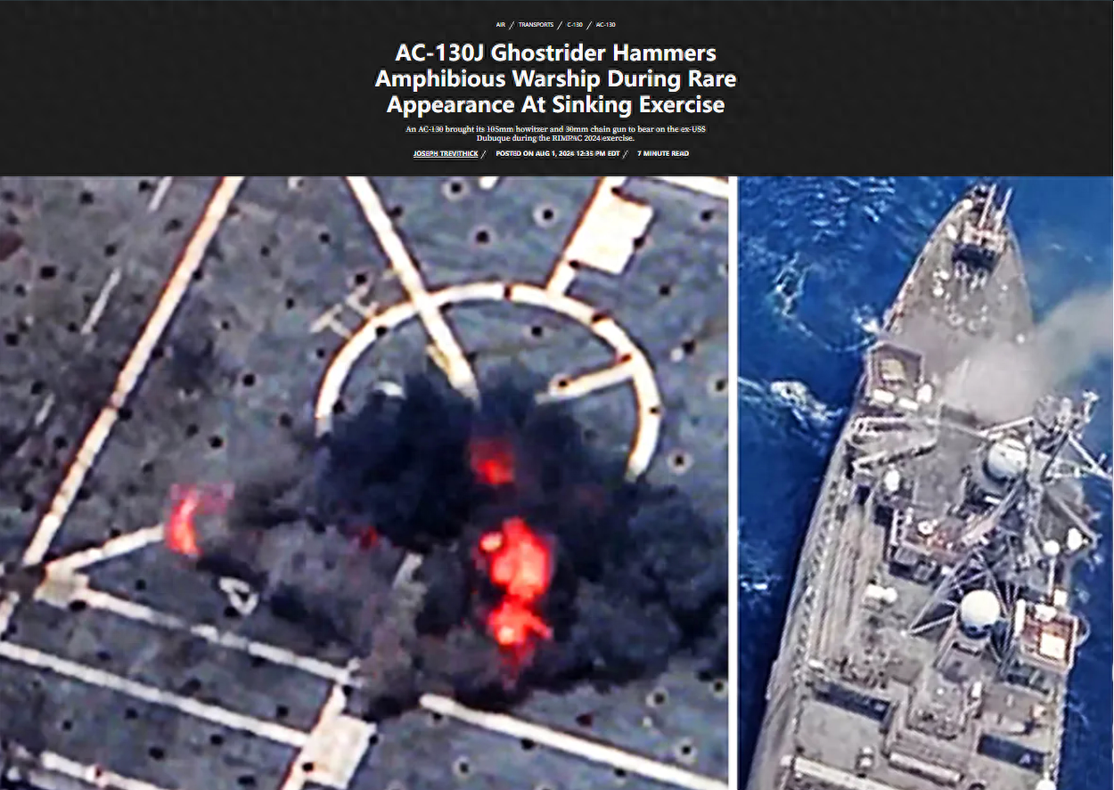 2024年度的环太平洋军事演习将进行两次SINKEX击沉演练,一艘靶舰是塔拉瓦级两栖攻击舰塔拉瓦号。另一艘则是奥斯汀级两栖船坞运输舰迪比克号。美媒战区注意到,主要用于对陆打击的AC-130J“幽灵骑士”空中炮艇罕见地参与了击沉演练,并盛赞了AC-130J的打击效能。