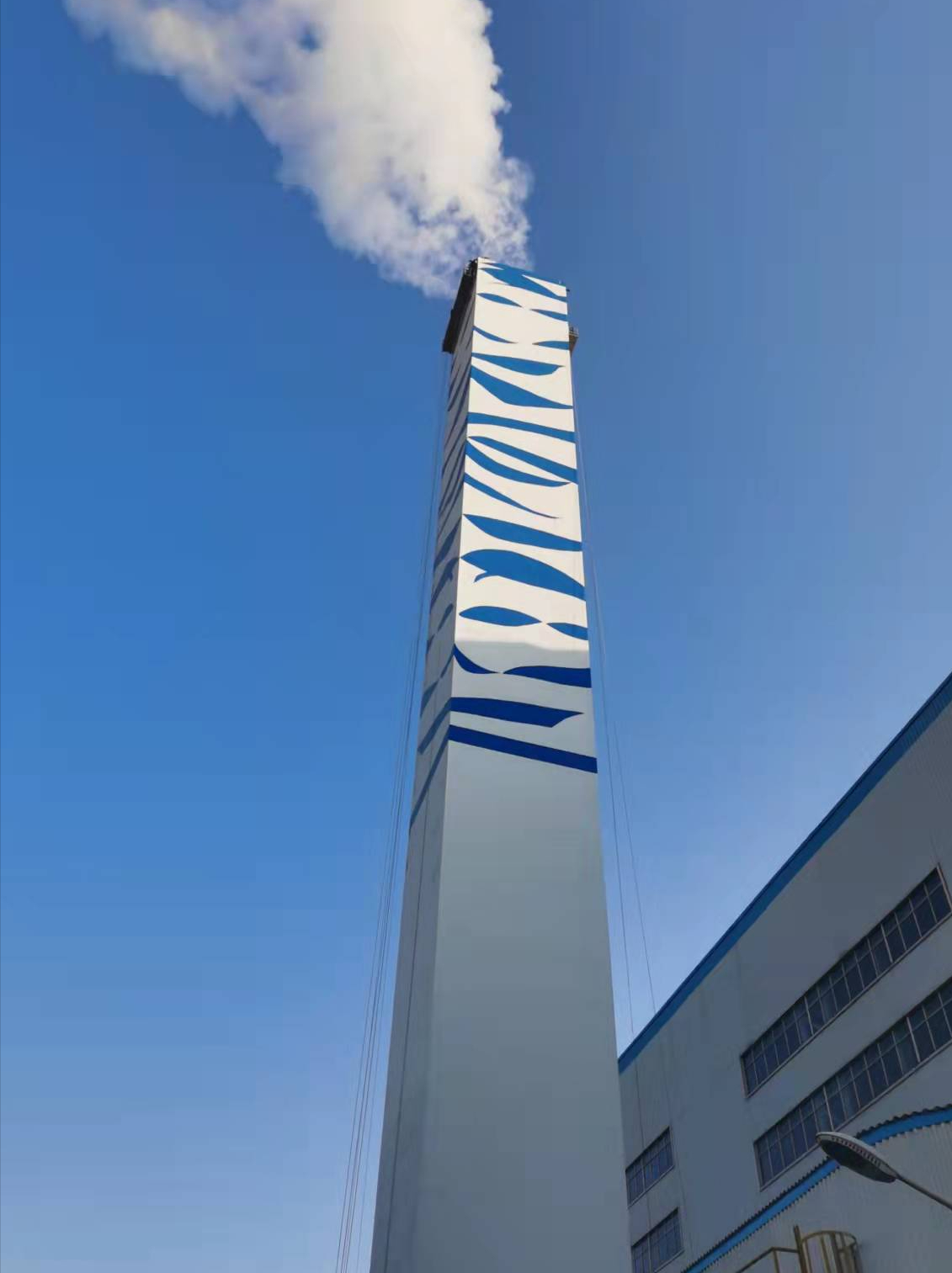 选用烟囱专用耐候抗紫外线氟碳漆 / 丙烯酸面漆(适配户外暴晒、腐蚀环境),按设计色号精准调色,搅拌均匀;采用高压无气喷涂 + 人工滚涂结合工艺,分底漆 + 面漆分层涂刷,底漆 1 遍封闭基底,面漆 2~3 遍确保色彩饱满,每遍间隔≥4 小时(完全固化),边缘用细毛刷修边,保证图案线条顺直、无溢色。