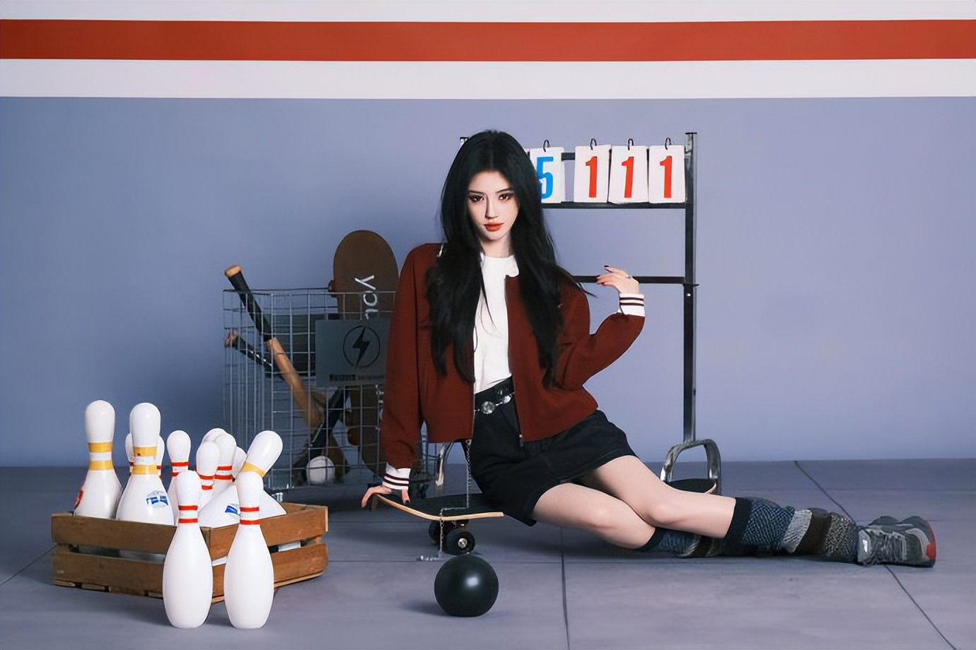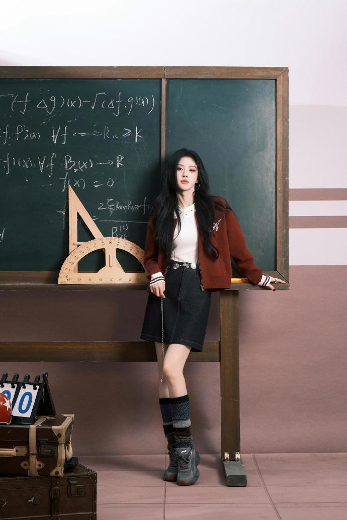 搭配的复古夹克则是本次造型的另一大亮点。夹克采用做旧工艺处理,肩线利落,袖口微卷,呈现出一种随性不羁的街头感。内搭选择简约黑色上衣,下身配以高腰长裤,拉长身形比例,凸显出鞠婧祎一贯纤细高挑的身材优势。黑长卷发自然垂落,与硬朗的夹克形成柔与刚的强烈对比,恰如其分地诠释了“甜酷”二字的精髓。