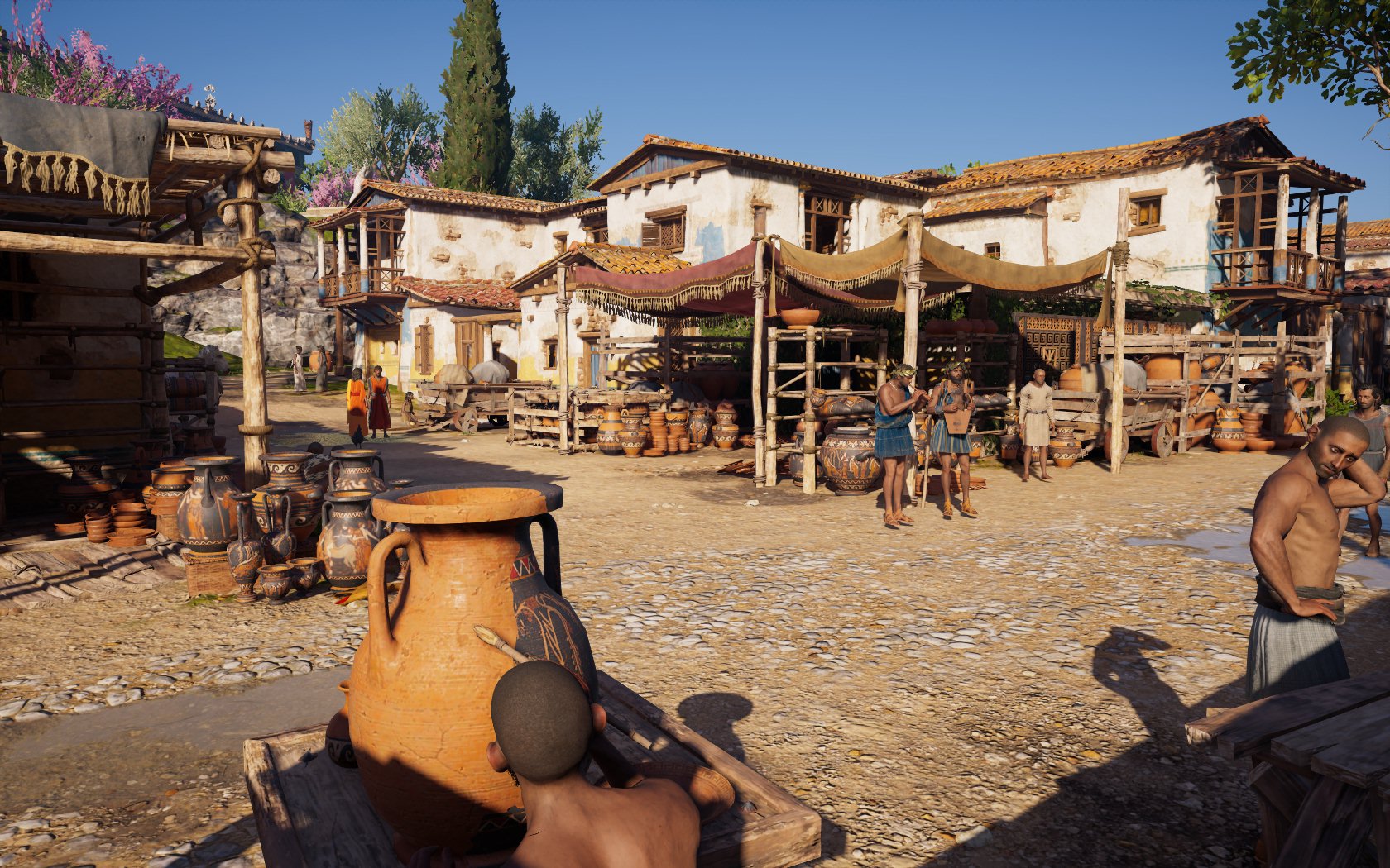 在公元前8-6世纪,科林斯几乎垄断了希腊与西方的贸易,其陶器、橄榄油、葡萄酒和金属器皿远销各地。游戏中的市场场景生动再现了这一繁荣景象,商贩叫卖声此起彼伏,各种货物堆积如山,甚至能看到标志性的科林斯式陶器,这些细节都让这座虚拟城市充满生机。游戏中出现的科林斯陶器,其独特的黑色釉彩与精美图案是历史上科林斯工艺的代表。