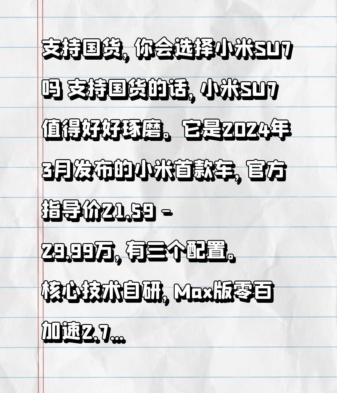 支持国货,你会选择小米SU7吗 支持国货的话,小米SU7值得好好琢磨。它是2024年3月发布的小米首款车,官方指导价21.59 - 29.99万,有三个配置。核心技术自研,Max版零百加速2.78秒,Pro版续航830km,充电15分钟补能350km。而且智能生态领先,安全配置也全。不过它也有不少问题。后排空间小,座椅硬;全景天幕夏天热;底盘低,轮胎薄;智驾不太稳;质保政策没诚意。但配置堆料足,性价比不错,语音交互还好使。如果追求高性能和智能体验,它是个选择;要是更看重成熟可靠,还得再考虑。