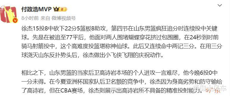 同样是球队后场主控,徐杰和高诗岩在同场较量中连续2场打出了如此差距悬殊的数据,这很难不让人质疑起郭士强的用人选择,媒体人付政浩赛后直言,相较于徐杰的出色表现,高诗岩本场的发挥实在差强人意。付政浩指出:“相比之下,山东男篮的当家后卫高诗岩在本场比赛中的个人进攻表现着实一言难尽,今晚他6投0中,一分未得。今夏在亚洲杯国家队后卫名额的竞争中,徐杰因身高劣势和防守能力稍逊,惜败于高诗岩。然而在CBA赛场上,徐杰却展现出高诗岩所欠缺的精准投射能力。”