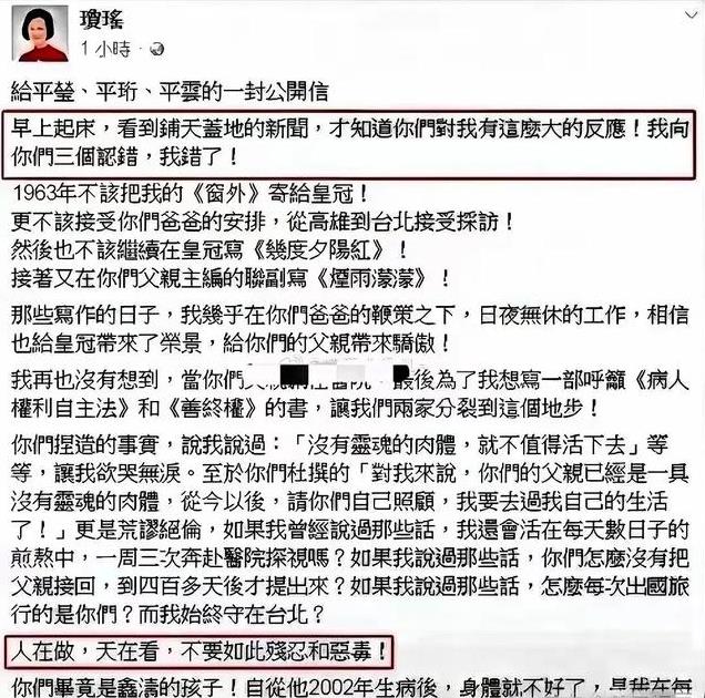 台媒也站在平云兄弟这边儿声讨琼瑶见死不救。琼瑶被铺天盖地的舆论所淹没。实在忍无可忍,她给三个继子女写了一封公开信。