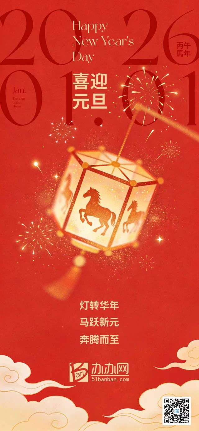 元旦快乐!办办网以马跃新元之姿,携奔腾之势与您共启2026新篇章,愿您在新的一年如骏马踏云,事业扶摇直上;似星河璀璨,机