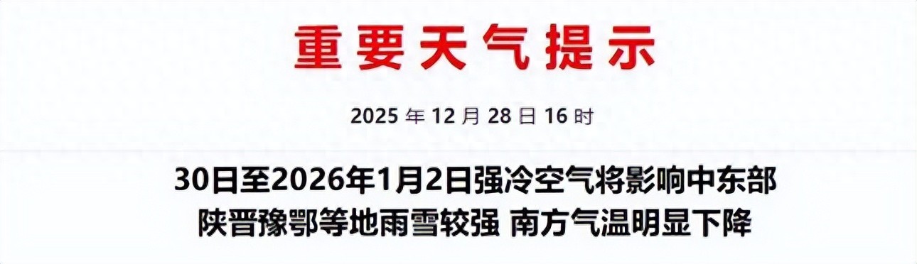 预计12月30日至2026年1月2日,强冷空气将影响中东部大部地区,带来4~5级风,南方地区降温更为明显;30日夜间至1月1日,陕西中南部、山西南部、河南西部、湖北西部等局地有大雪或暴雪。元旦假期临近,请公众关注大风、降温及雨雪天气对出行等的影响。