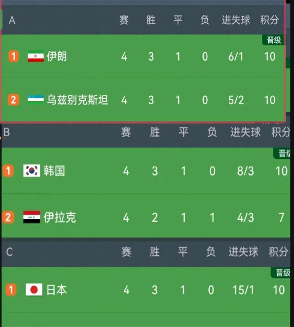 有趣的是,这三个小组的第一名都取得了3胜1平的战绩,同积10分,这种巧合无疑让接下来的比赛更加充满悬念和竞争。