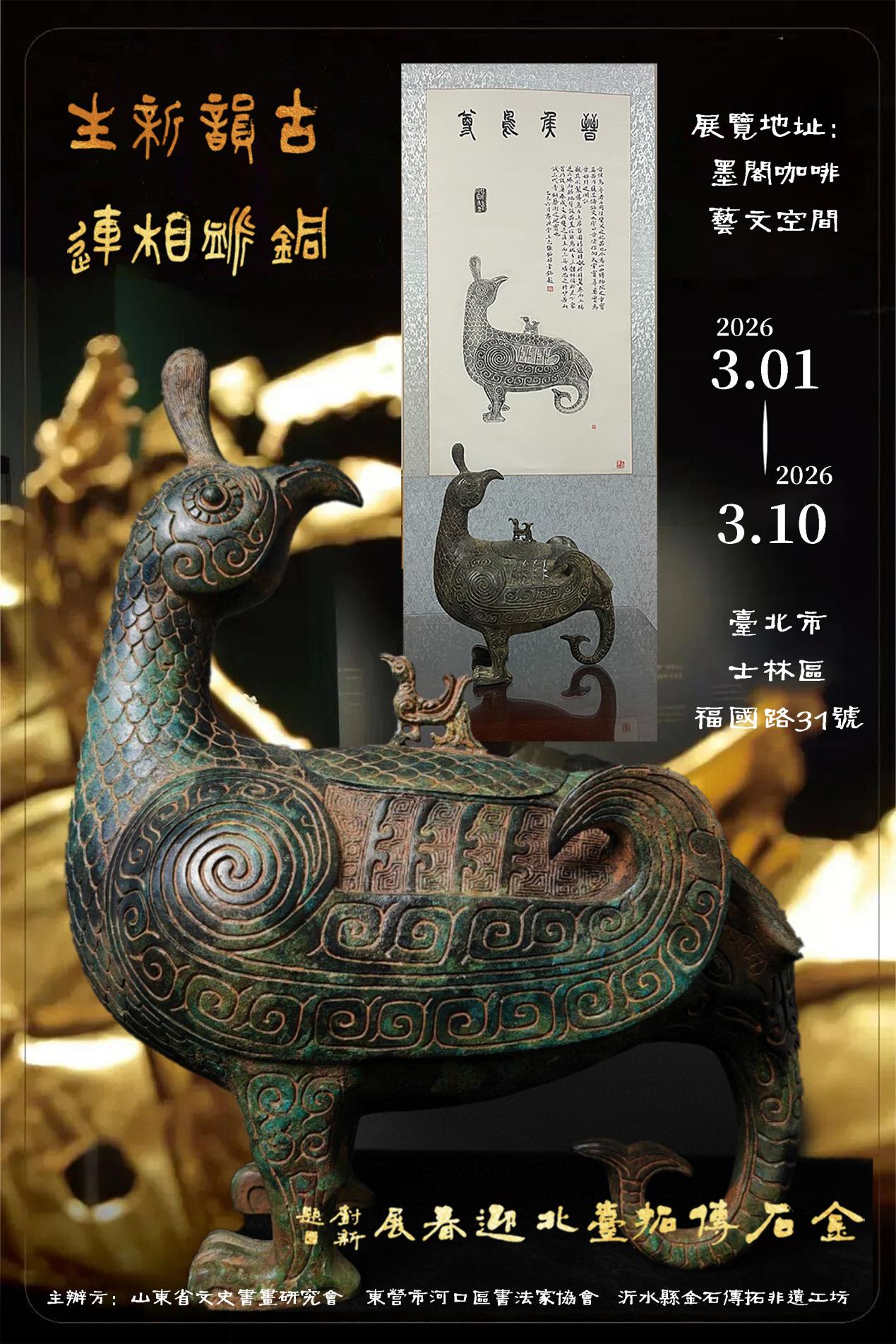 2026年3月 《古韻新生 銅脈相連——金石傳拓臺北迎春展》將在中國臺北墨閣咖啡藝文空間啟幕。沂水金石傳拓非遺工坊,這個地處沂蒙山,離縣城二十華里的四十裏堡小作坊,默默耕耘金石傳拓幾代的非遺技藝傳承人,帶著三十餘件拓片題跋補繪精品走出山溝,迎春中國臺北。