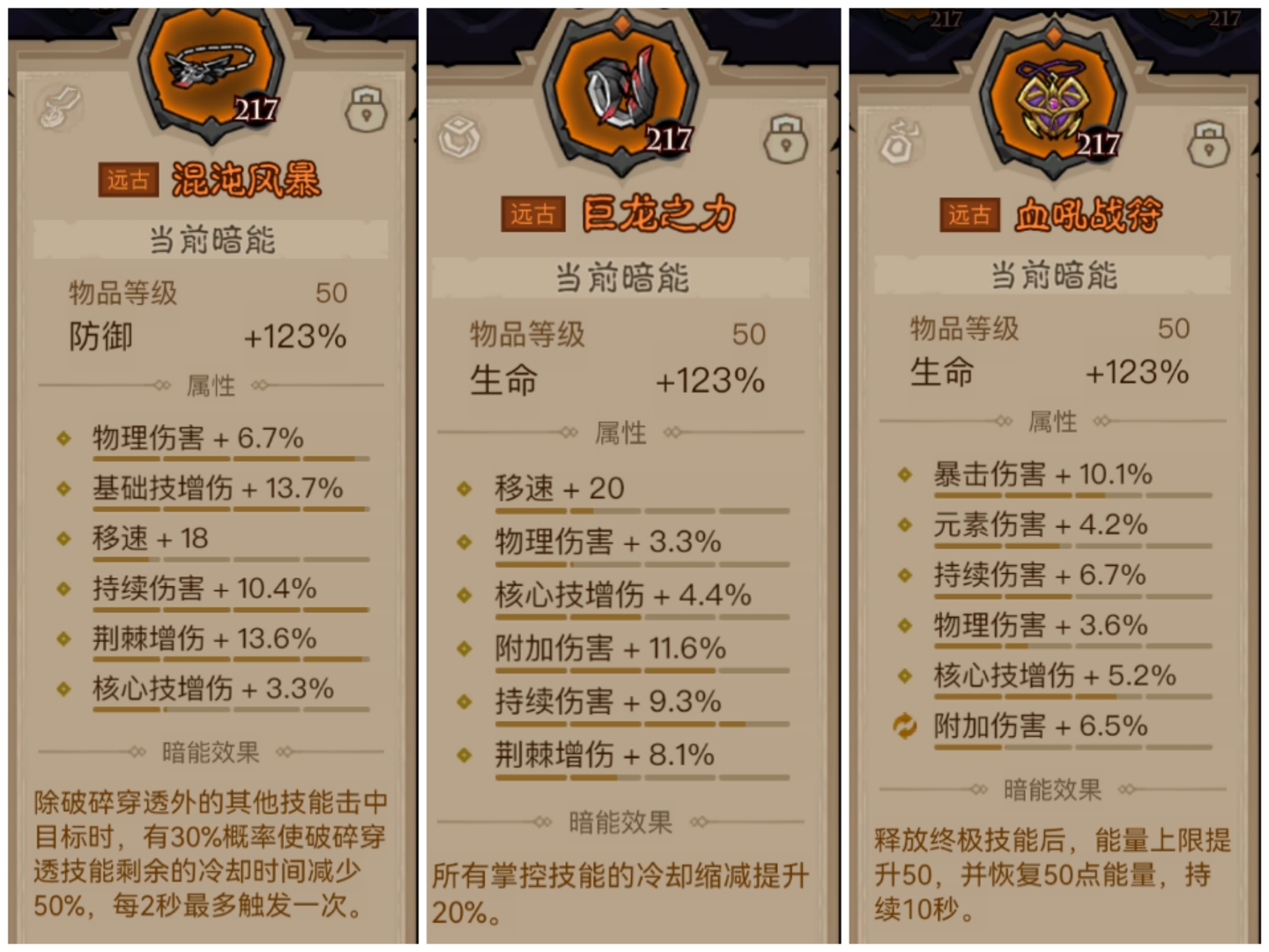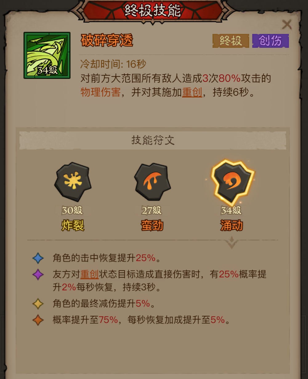 破碎穿透(核心技能②):常用就选涌动,保证存活率。输出再选蛮劲