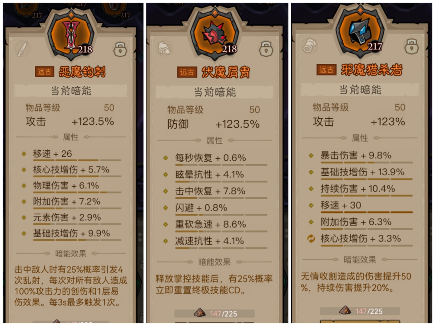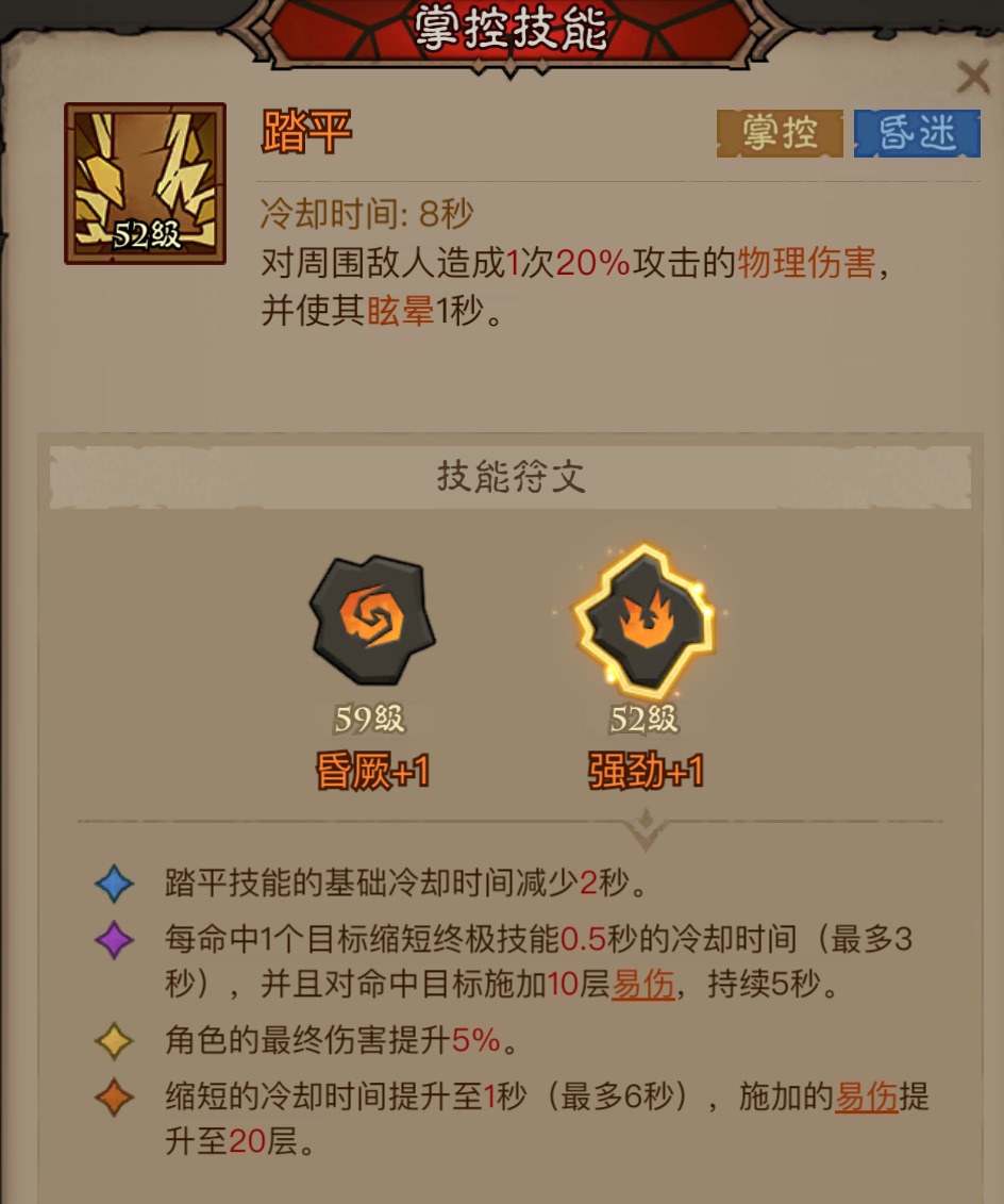 无情收割(核心技能①):有人说火刀输出更牛,需要保证暴击暴伤,但我只抽到祭刀,感觉叠创伤数量还得是祭刀,造成6次伤害的同时,每次还叠加创伤,腐溃算是锦上添花吧。踏平:减CD、打断敌人施法、叠易伤,都是好东西。CD短了释放也快,搭配暗能的减CD词条可以更短,为了触发伏魔肩胄。(掌控技能)