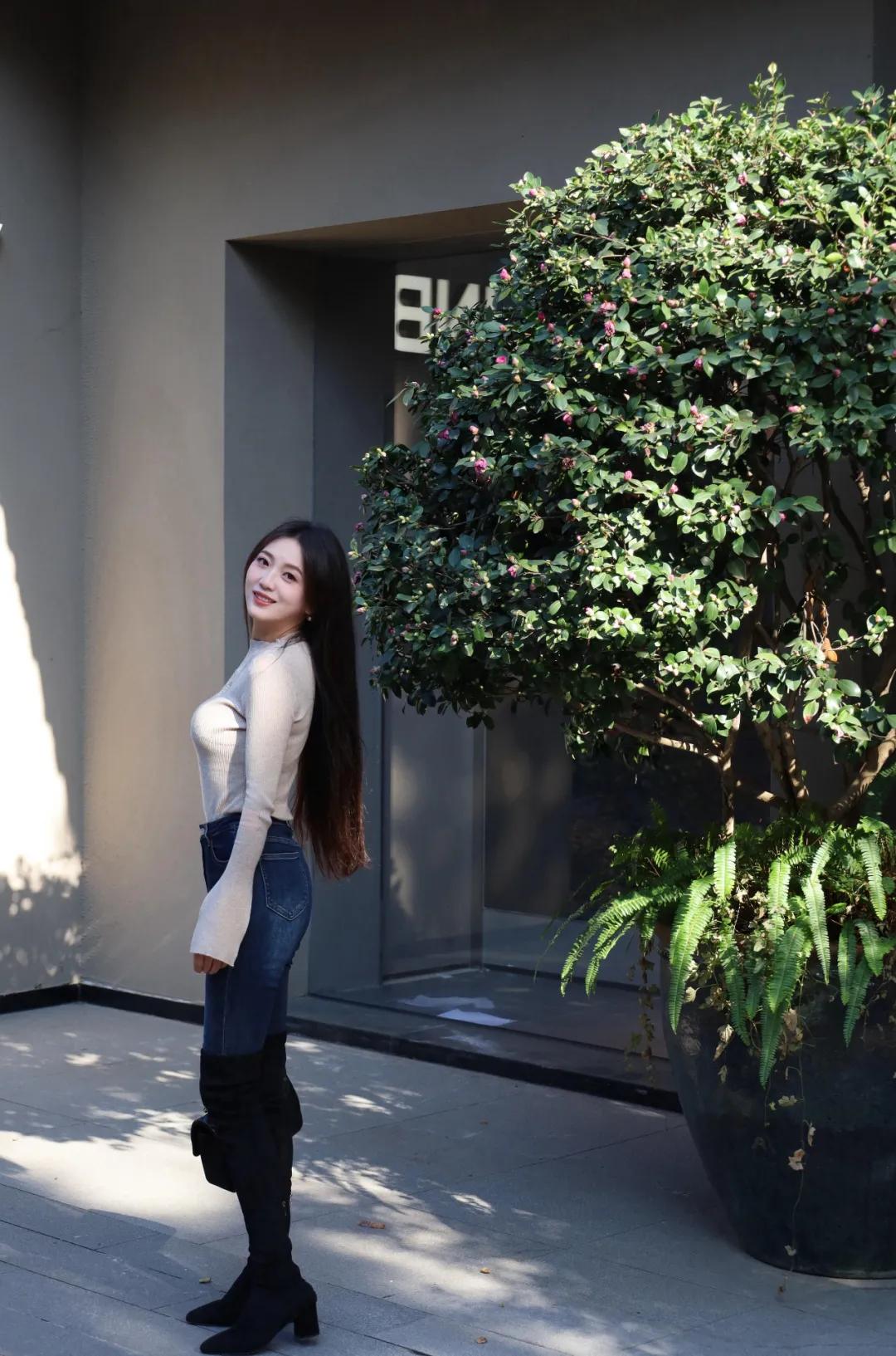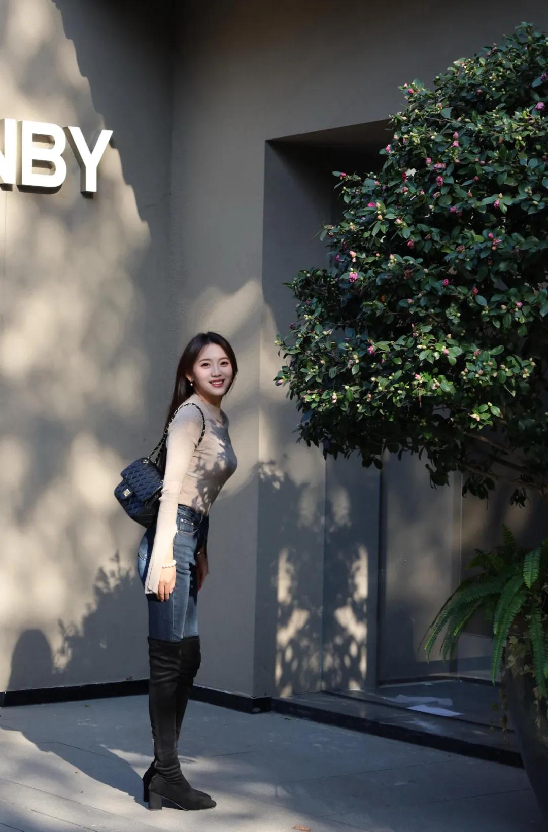 全身照拍照时侧身挎包能让身体更有生活感,微微俯身的站姿可以让画面不显得僵硬,回头一笑会让整张照片看起来更亲切,又显身材又显长腿吗,很好看。