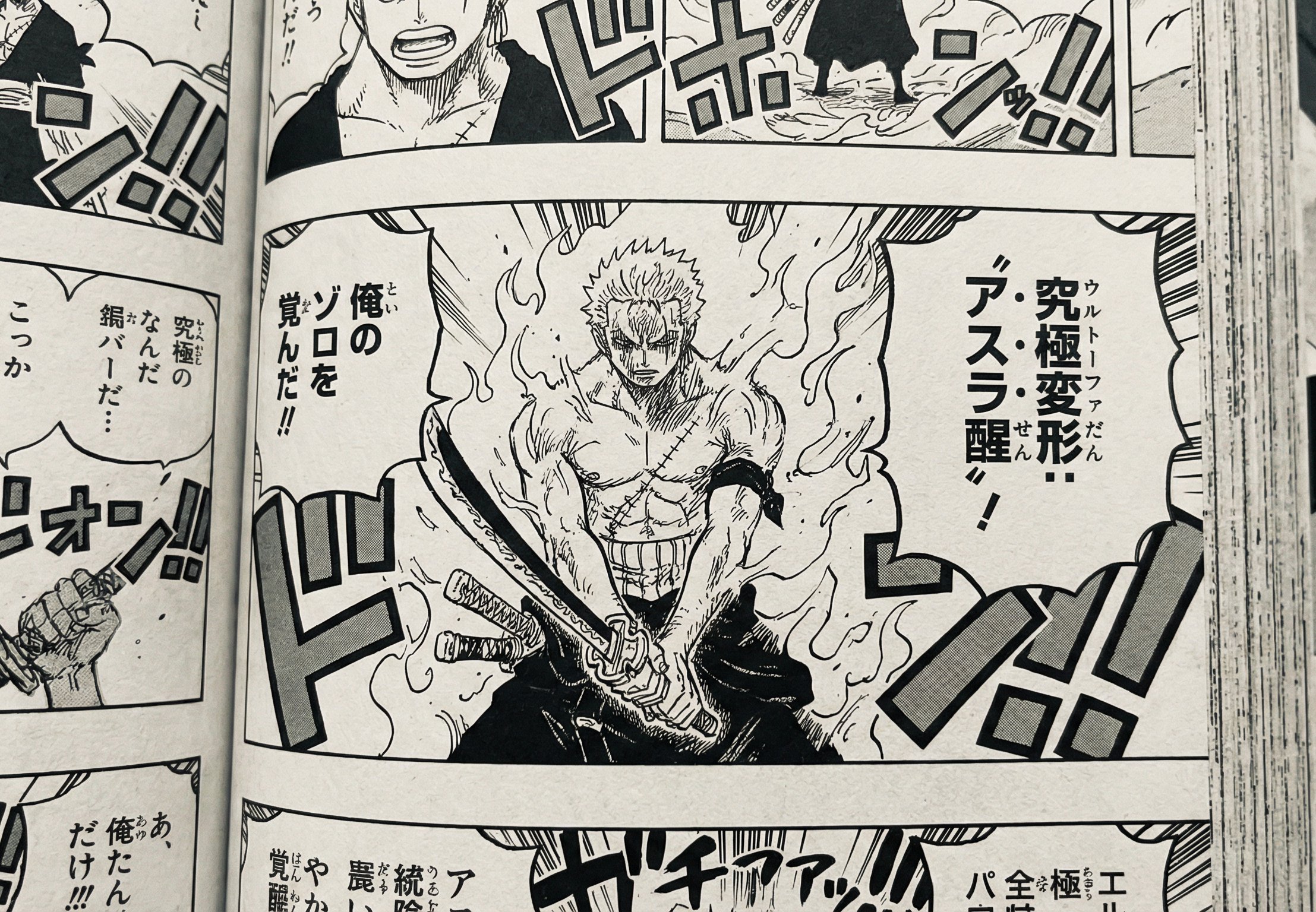 索隆收下了两位两把刀,单独拿出三代鬼彻。因为要使用鬼神的力量只能用三代鬼彻来搭配,再融合自身的两股霸气,这是索隆新掌握的究极变形之力,是打算一招将麒麟戈姆彻底秒杀,顺便终结他那引以为傲的不死之身。
