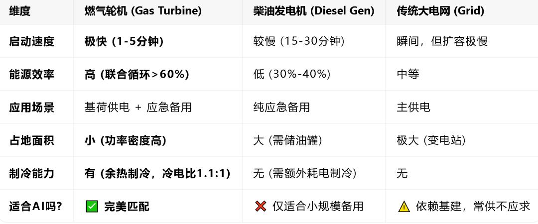 再者,燃气轮机体积小,功率密度高。在同等功率下,燃气轮机占地面积远小于柴油发电机组。这对于数据中心园区意味着可以腾出更多空间放置AI服务器。