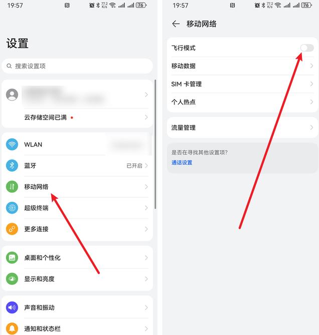 方法二:在手机设置中,找到【移动网络】,点击它就能看到【飞行模式】的设置按钮,点击右侧的开关进行调整就可以,如下图所示: