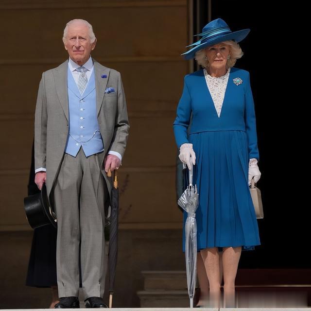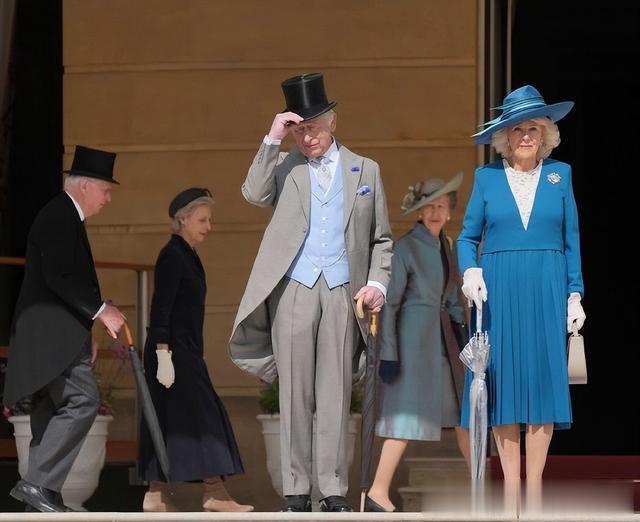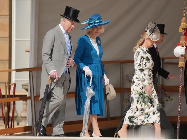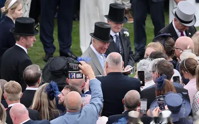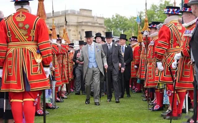 参加花园派对,王室成员和参加的宾客都穿着正装。查尔斯国王在这次活动中戴上了传统的高顶礼帽和灰色燕尾服,内搭了浅蓝色马甲,而在西装领口处却还别着一朵矢车菊,相当引人瞩目。