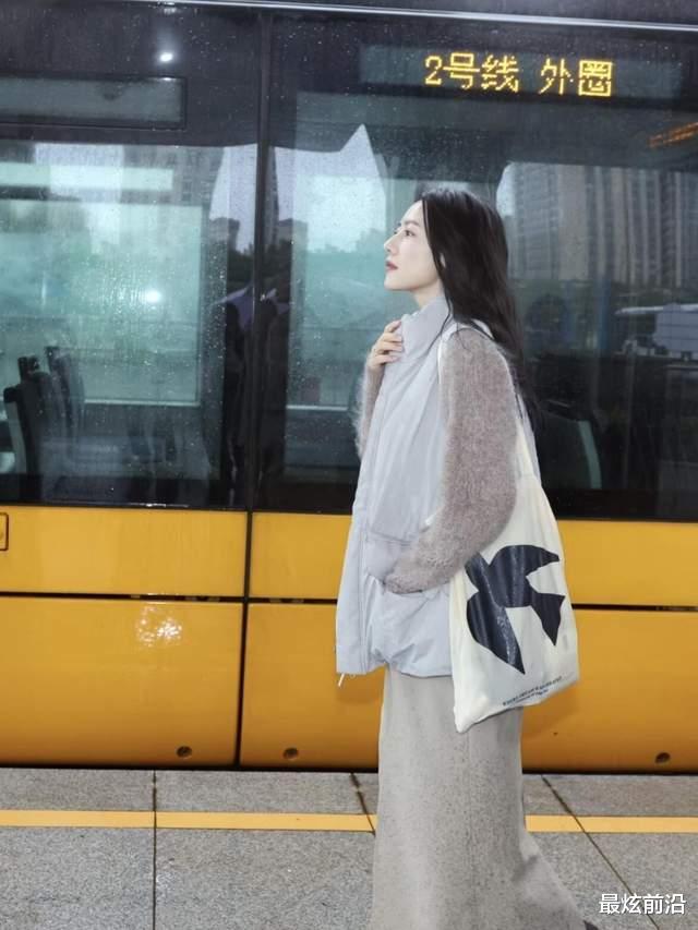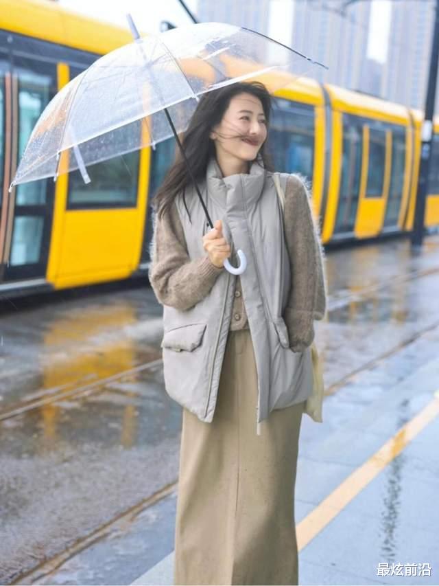 高圆圆本人肤白貌美,身材高挑,内搭的短款毛衣充分提高腰线,拉长下半身比例。外搭的立领羽绒马甲既提供了保暖的实用性,还为内搭增添了视觉上的层次感。