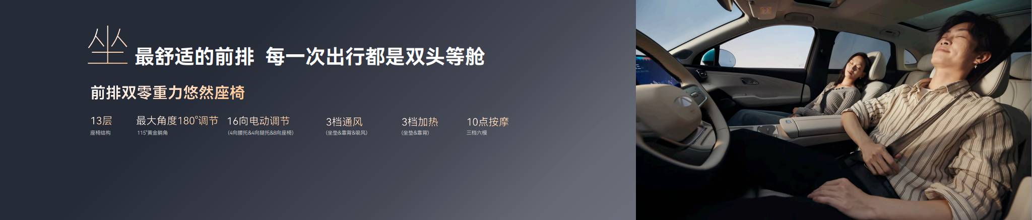 前排双零重力座椅,16 向电动调节 + 通风 / 加热 / 按摩,副驾同样享受头等舱体验