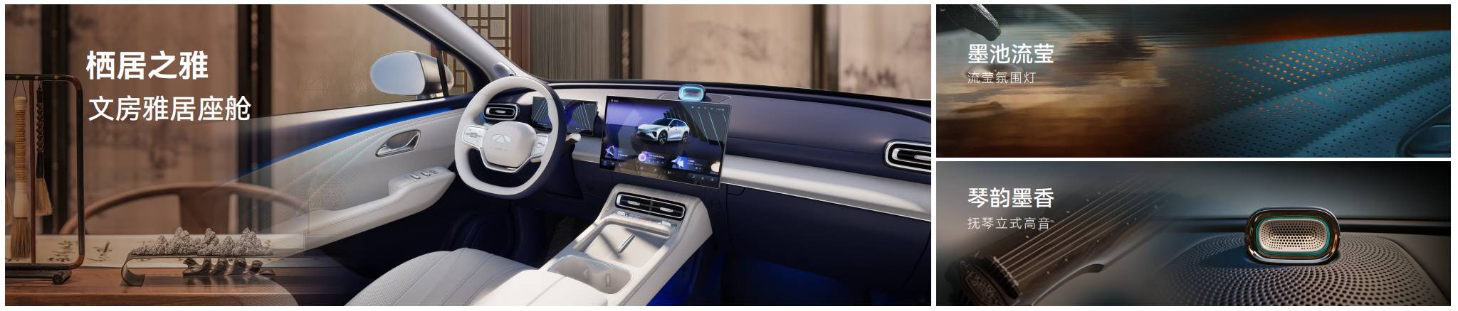 座舱走 “文房雅居” 风,软质包覆 + 氛围灯 + 伯牙之音音响,听觉视觉都有东方意境