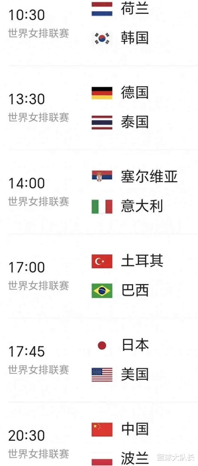 世界女排联赛第3周最后一个比赛日在日本福冈和中国香港进行,一共有6场比赛,分别是10时30分荷兰对韩国,13时30分德国对泰国,14时塞尔维亚战意大利,17时巴西对土耳其,17时45分日本迎战美国,20时30分中国对波兰。
