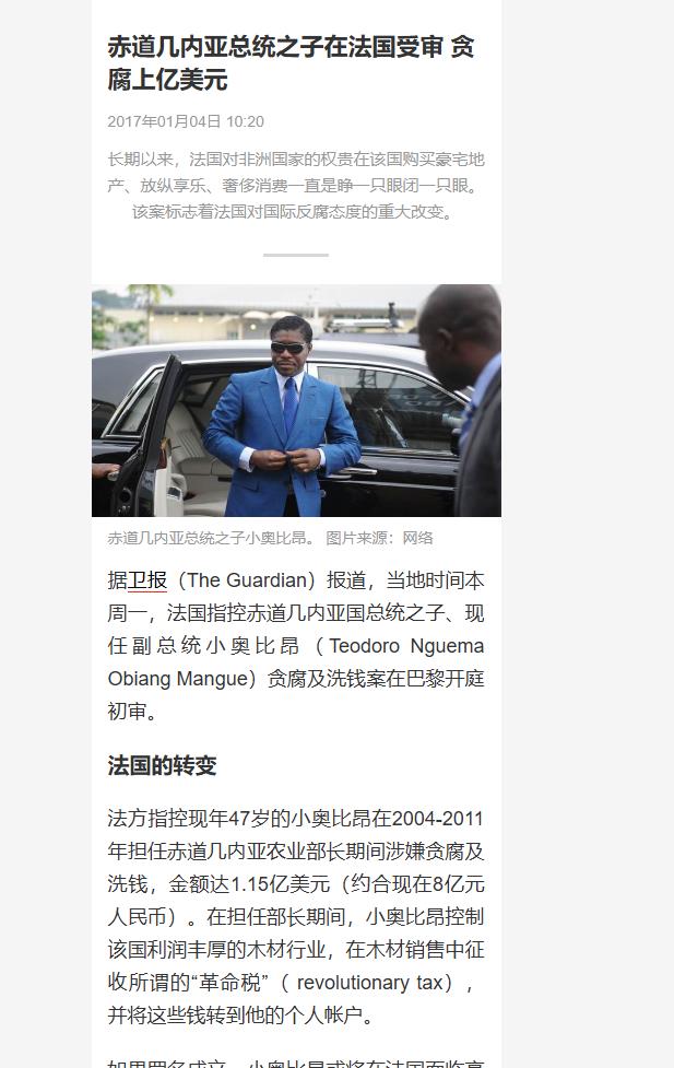 《赤道几内亚总统之子在法国受审 贪腐上亿美元》,佚名