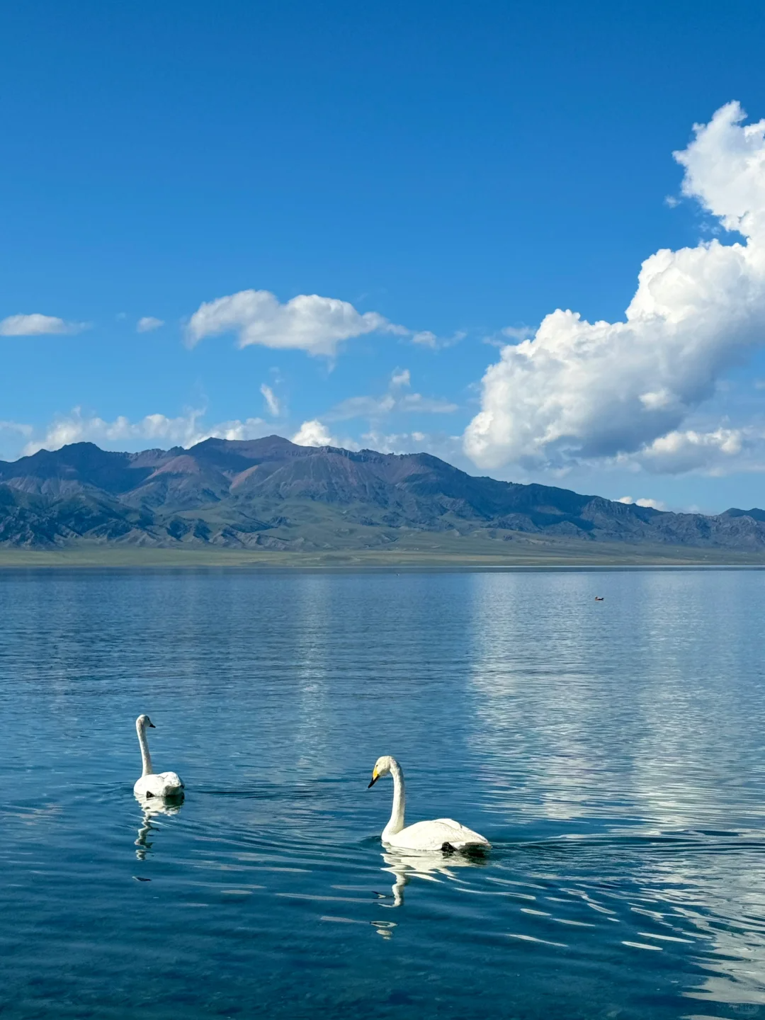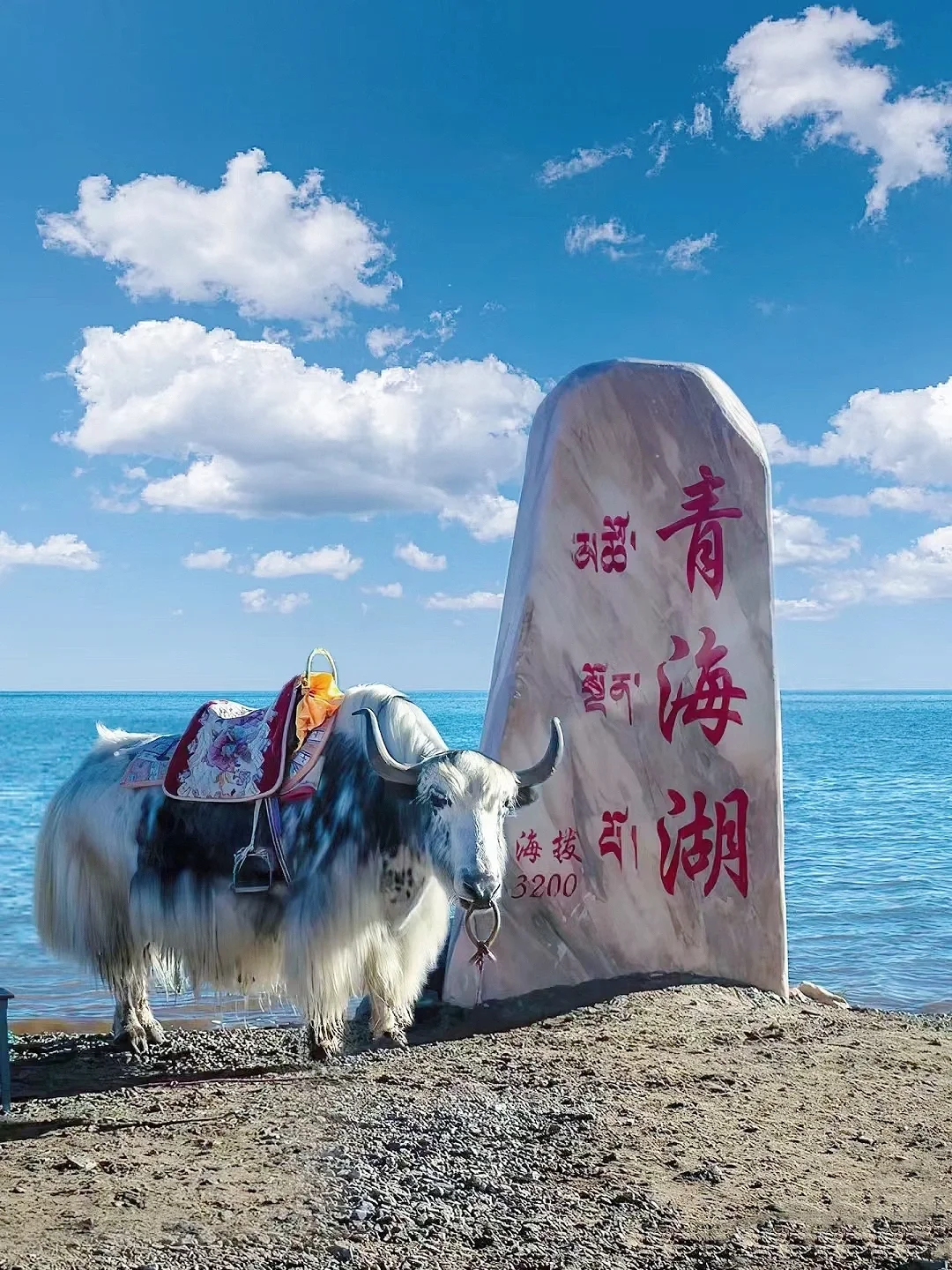 她位于青藏高原之上,四周被祁连山脉环抱,湖水比天空还要蓝,与天际相连。