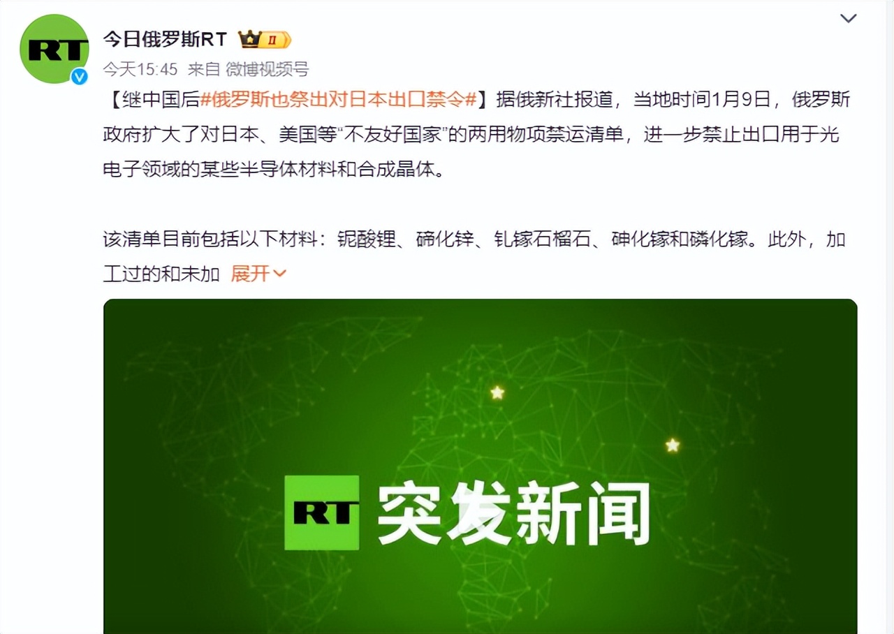 就在我们刚刚制定这个措施后,俄罗斯也跟进下重手了,据媒体报道称,在当地时间1月9日的时候,俄罗斯政府扩大了对日本、美国等“不友好国家”的两用物项禁运清单,进一步禁止出口用于光电子领域的某些半导体材料和合成晶体。这次不仅针对日本和美国,还包括乌克兰、澳大利亚、英国、欧盟、冰岛、加拿大、新西兰、挪威、韩国、瑞士等很多国家,可以说也直接断了日本从其他国家获得此类物资的妄想。