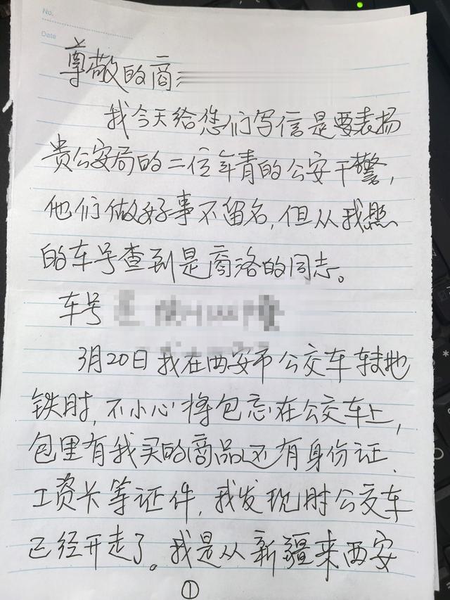 问完原由后,王晓东、王伟没有一刻耽搁,就立即和老人一起确定了乘坐公交车的线路和车次,他们根据导航指引,驾驶警车追赶刘某某乘坐的那趟公交车。经过十几个站点的追寻,终于找了刘某某乘坐的那路公交车,王晓东、王伟在与公交车司机沟通询问后,终于将刘某某的提包找回。当时王晓东、王伟因办理案件事情紧急,找到提包后就随即离开了,刘某某没来得及表示感谢,也没有问及两名民警的情况,仅是记住警车的警号。3月24日,老人刘某某为表示对帮助自己的两名同志的感谢,将相关信息反馈给了陕西电视台都市快报记者。3月25日,陕西电视台采访报道了老人丢包被商洛两民警及时找回的新闻报道。但是,老人刘某某想当面感谢两名民警的心愿却未能达成。在咨询相关部门的建议下,老人刘某某专门手写了一封感谢信,并将感谢信邮递给了商洛市公安局办公室。因此才有了文章开头的事情。