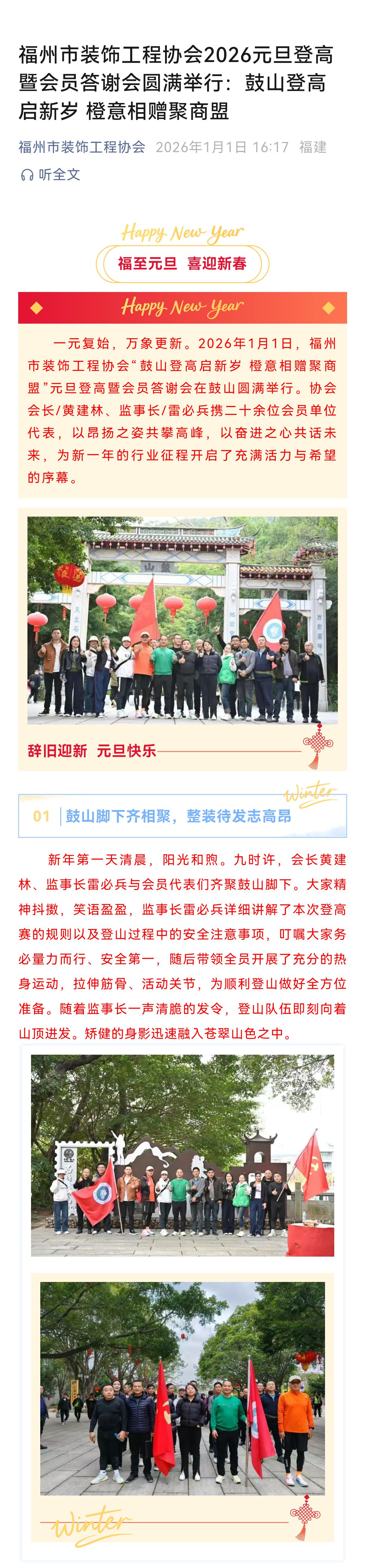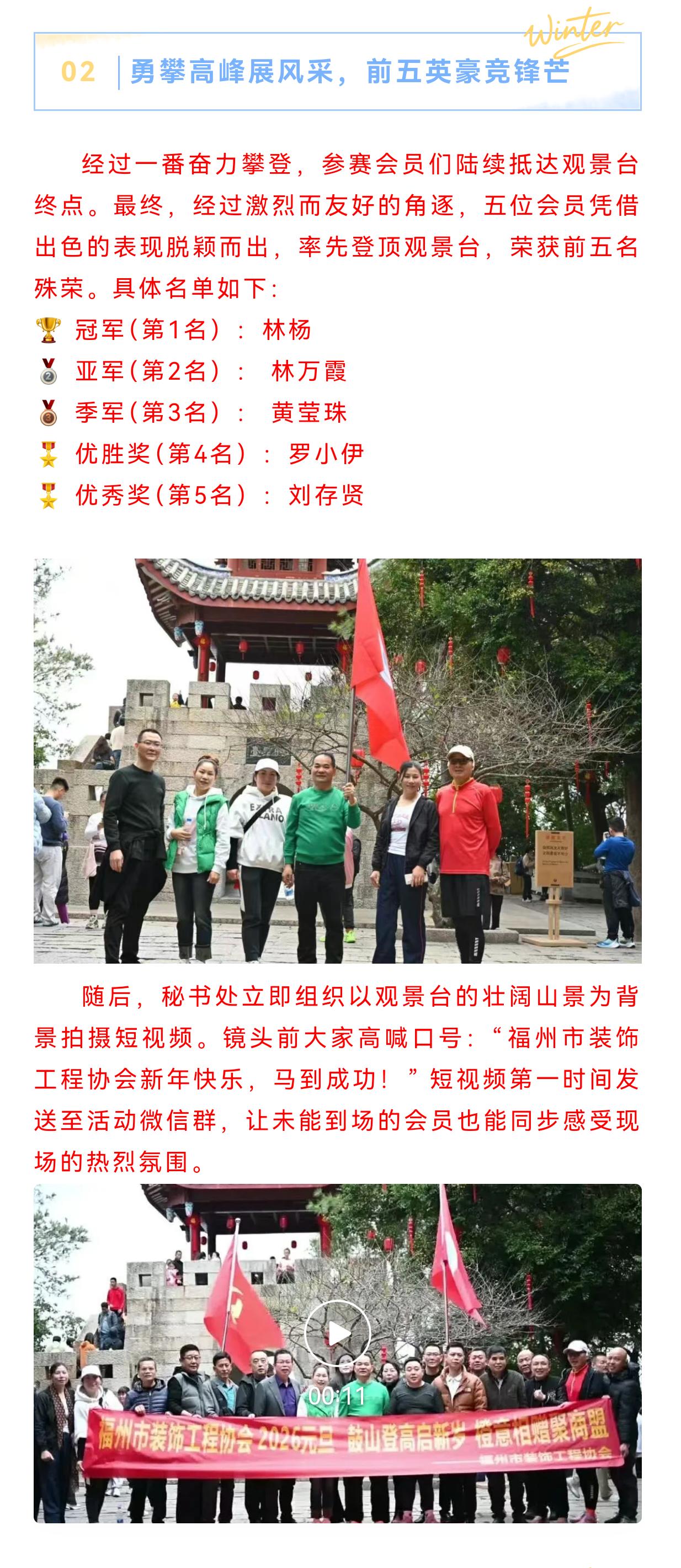 【编者按】元旦登高,向来是中国人寄寓“更上一层楼”的传统仪式。而福州市装饰工程协会此次鼓山之行,却将这古老的仪式,注入了全新的时代内涵与行业魂魄。这不仅仅是一次集体的健身或联谊。在山路攀升的脚步中,我们看到了一个行业面对周期挑战时,所秉持的那份“向上”的原始韧劲;在山顶开阔的视野与席间坦诚的交流中,我们更窥见了一种超越个体竞争的、携手“共攀”行业新峰的智慧与格局。活动巧妙地以“登山”为隐喻,将体能的淬炼、情感的凝聚与战略的谋划,熔铸于一体。