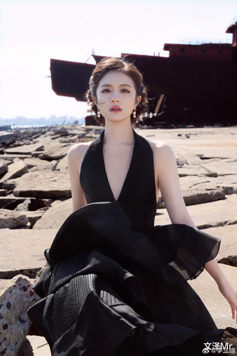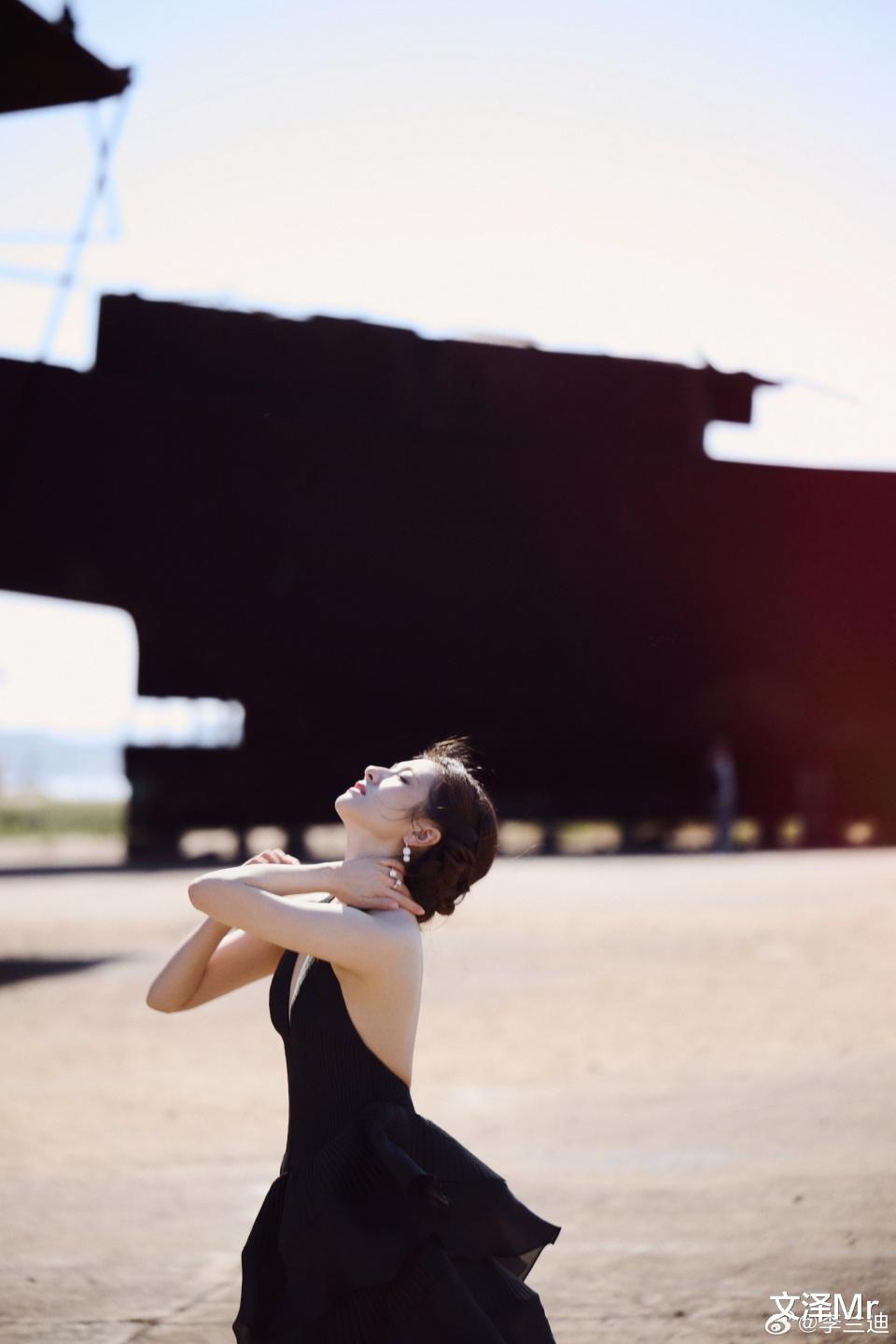 当 24 岁的李兰迪穿着一袭深 V 黑裙,坐在废弃码头的碎石堆上时,没人会再把她和《你好,旧时光》里的 “余周周” 划等号 —— 那个软萌的 “国民妹妹”,早长成了自带故事感的时尚缪斯。
